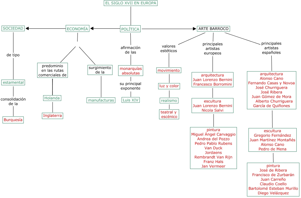 Este Cmap, tiene información relacionada con: Alejandro Ruiz Fernández de Angulo 2º E.S.O. B Tema 11- El siglo del Barroco (Esquema página 196), ARTE BARROCO principales artistas españoles arquitectura Alonso Cano Fernando Casas y Novoa José Churriguera José Ribera Juan Gómez de Mora Alberto Churriguera García de Quiñones, EL SIGLO XVII EN EUROPA SOCIEDAD, ARTE BARROCO valores estéticos movimiento, estamental consolidación de la Burquesía, movimiento ???? luz y color, surgimiento de la ???? manufacturas, EL SIGLO XVII EN EUROPA ECONOMÍA, monarquías absolutas su principal exponente Luis XIV, realismo ???? teatral y escénico, ECONOMÍA surgimiento de la, ECONOMÍA predominio en las rutas comerciales de, predominio en las rutas comerciales de ???? Inglaterra, EL SIGLO XVII EN EUROPA POLÍTICA, POLÍTICA afirmación de las monarquías absolutas, escultura Gregorio Fernández Juan Martínez Montañés Alonso Cano Pedro de Mena ???? pintura José de Ribera Francisco de Zurbarán Juan Carreño Claudio Coello Bartolomé Esteban Murillo Diego Velázquez, SOCIEDAD de tipo estamental, luz y color ???? realismo, ARTE BARROCO principales artistas europeos arquitectura Juan Lorenzo Bernini Francesco Borromini, escultura Juan Lorenzo Bernini Nicola Salvi ???? pintura Miguel Ángel Carvaggio Andrea del Pozzo Pedro Pablo Rubens Van Dyck Jordaens Rembrandt Van Rijn Franz Hals Jan Vermeer, POLÍTICA ???? ARTE BARROCO
