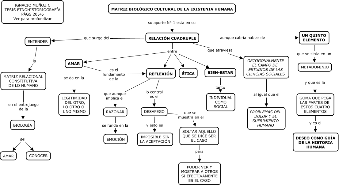 Este Cmap, tiene información relacionada con: Matríz Biologico Cultural de la Existencia Humana, SOLTAR AQUELLO QUE SE DICE SER EL CASO para PODER VER Y MOSTRAR A OTROS SI EFECTIVAMENTE ES EL CASO, BIEN-ESTAR tanto INDIVIDUAL COMO SOCIAL, DESAPEGO y esto es IMPOSIBLE SIN LA ACEPTACIÓN, ORTOGONALMENTE EL CAMPO DE ESTUDIOS DE LAS CIENCIAS SOCIALES al igual que el PROBLEMAS DEL DOLOR Y EL SUFRIMIENTO HUMANO, BIOLOGÍA del CONOCER, UN QUINTO ELEMENTO que se sitúa en un METADOMINIO, RELACIÓN CUADRUPLE entre ÉTICA, AMAR es el fundamento de la REFLEXIÓN, RELACIÓN CUADRUPLE entre BIEN-ESTAR, RELACIÓN CUADRUPLE aunque cabría hablar de UN QUINTO ELEMENTO, DESAPEGO que se muestra en el SOLTAR AQUELLO QUE SE DICE SER EL CASO, RAZONAR se funda en la EMOCIÓN, MATRIZ RELACIONAL CONSTITUTIVA DE LO HUMANO en el entrejuego de la BIOLOGÍA, REFLEXIÓN lo central es el DESAPEGO, ENTENDER la MATRIZ RELACIONAL CONSTITUTIVA DE LO HUMANO, RELACIÓN CUADRUPLE que surge del ENTENDER, AMAR se da en la LEGITIMIDAD DEL OTRO, LO OTRO O UNO MISMO, BIOLOGÍA del AMAR, GOMA QUE PEGA LAS PARTES DE ESTOS CUATRO ELEMENTOS y es el DESEO COMO GUÍA DE LA HISTORIA HUMANA, MATRIZ BIOLÓGICO CULTURAL DE LA EXISTENIA HUMANA su aporte Nº 1 esta en su RELACIÓN CUADRUPLE