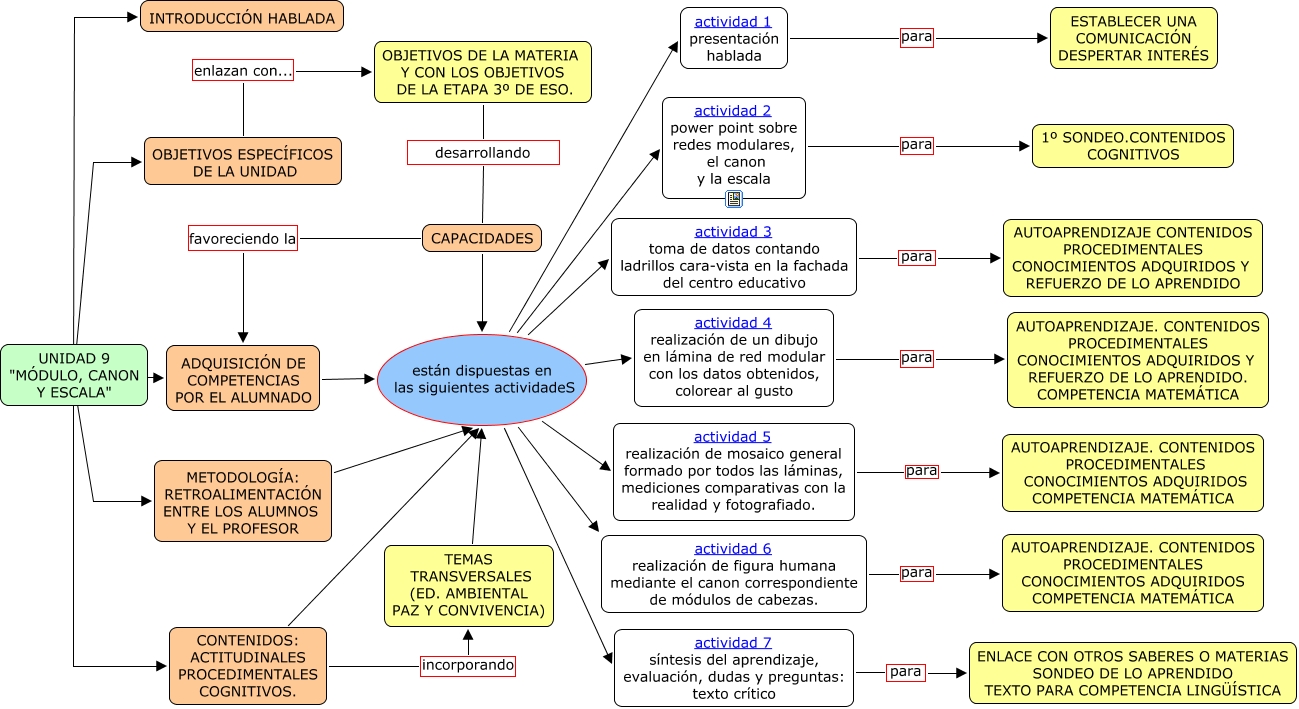 Este Cmap, tiene información relacionada con: unidad 9, actividad 1 presentación hablada para ESTABLECER UNA COMUNICACIÓN DESPERTAR INTERÉS, CONTENIDOS: ACTITUDINALES PROCEDIMENTALES COGNITIVOS. están dispuestas en las siguientes actividadeS actividad 3 toma de datos contando ladrillos cara-vista en la fachada del centro educativo, METODOLOGÍA: RETROALIMENTACIÓN ENTRE LOS ALUMNOS Y EL PROFESOR están dispuestas en las siguientes actividadeS actividad 3 toma de datos contando ladrillos cara-vista en la fachada del centro educativo, CAPACIDADES están dispuestas en las siguientes actividadeS actividad 4 realización de un dibujo en lámina de red modular con los datos obtenidos, colorear al gusto, ADQUISICIÓN DE COMPETENCIAS POR EL ALUMNADO están dispuestas en las siguientes actividadeS actividad 4 realización de un dibujo en lámina de red modular con los datos obtenidos, colorear al gusto, CONTENIDOS: ACTITUDINALES PROCEDIMENTALES COGNITIVOS. están dispuestas en las siguientes actividadeS actividad 7 síntesis del aprendizaje, evaluación, dudas y preguntas: texto crítico, OBJETIVOS DE LA MATERIA Y CON LOS OBJETIVOS DE LA ETAPA 3º DE ESO. desarrollando CAPACIDADES, ADQUISICIÓN DE COMPETENCIAS POR EL ALUMNADO están dispuestas en las siguientes actividadeS actividad 7 síntesis del aprendizaje, evaluación, dudas y preguntas: texto crítico, actividad 3 toma de datos contando ladrillos cara-vista en la fachada del centro educativo para AUTOAPRENDIZAJE CONTENIDOS PROCEDIMENTALES CONOCIMIENTOS ADQUIRIDOS Y REFUERZO DE LO APRENDIDO, UNIDAD 9 "MÓDULO, CANON Y ESCALA" ???? METODOLOGÍA: RETROALIMENTACIÓN ENTRE LOS ALUMNOS Y EL PROFESOR, actividad 4 realización de un dibujo en lámina de red modular con los datos obtenidos, colorear al gusto para AUTOAPRENDIZAJE. CONTENIDOS PROCEDIMENTALES CONOCIMIENTOS ADQUIRIDOS Y REFUERZO DE LO APRENDIDO. COMPETENCIA MATEMÁTICA, METODOLOGÍA: RETROALIMENTACIÓN ENTRE LOS ALUMNOS Y EL PROFESOR están dispuestas en las siguientes actividadeS actividad 1 presentación hablada, actividad 6 realización de figura humana mediante el canon correspondiente de módulos de cabezas. para AUTOAPRENDIZAJE. CONTENIDOS PROCEDIMENTALES CONOCIMIENTOS ADQUIRIDOS COMPETENCIA MATEMÁTICA, CAPACIDADES están dispuestas en las siguientes actividadeS actividad 6 realización de figura humana mediante el canon correspondiente de módulos de cabezas., actividad 2 power point sobre redes modulares, el canon y la escala para 1º SONDEO.CONTENIDOS COGNITIVOS, METODOLOGÍA: RETROALIMENTACIÓN ENTRE LOS ALUMNOS Y EL PROFESOR están dispuestas en las siguientes actividadeS actividad 6 realización de figura humana mediante el canon correspondiente de módulos de cabezas., CAPACIDADES están dispuestas en las siguientes actividadeS actividad 1 presentación hablada, METODOLOGÍA: RETROALIMENTACIÓN ENTRE LOS ALUMNOS Y EL PROFESOR están dispuestas en las siguientes actividadeS actividad 4 realización de un dibujo en lámina de red modular con los datos obtenidos, colorear al gusto, ADQUISICIÓN DE COMPETENCIAS POR EL ALUMNADO están dispuestas en las siguientes actividadeS actividad 6 realización de figura humana mediante el canon correspondiente de módulos de cabezas., CONTENIDOS: ACTITUDINALES PROCEDIMENTALES COGNITIVOS. están dispuestas en las siguientes actividadeS actividad 5 realización de mosaico general formado por todos las láminas, mediciones comparativas con la realidad y fotografiado.