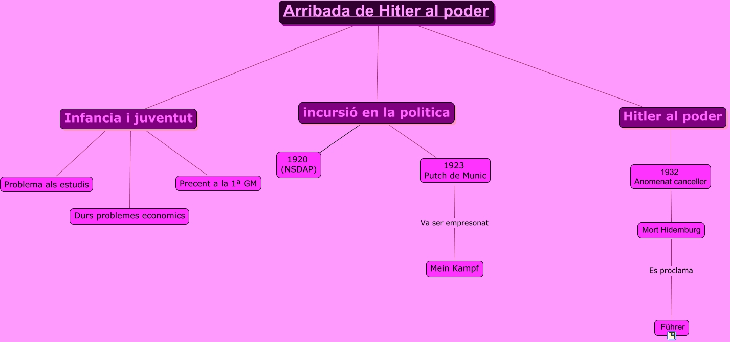 Este Cmap, tiene información relacionada con: historia 2 GM, Arribada de Hitler al poder ???? incursió en la politica, Infancia i juventut va ser Problema als estudis, Infancia i juventut ???? Precent a la 1ª GM, incursió en la politica ???? 1923 Putch de Munic, incursió en la politica Crea 1920 (NSDAP), 1923 Putch de Munic Va ser empresonat Mein Kampf, Mort Hidemburg Es proclama Führer, Arribada de Hitler al poder ???? Hitler al poder, Infancia i juventut ???? Durs problemes economics, Arribada de Hitler al poder Qui era Hitler? Infancia i juventut, 1932 Anomenat canceller ???? Mort Hidemburg, Hitler al poder ???? 1932 Anomenat canceller