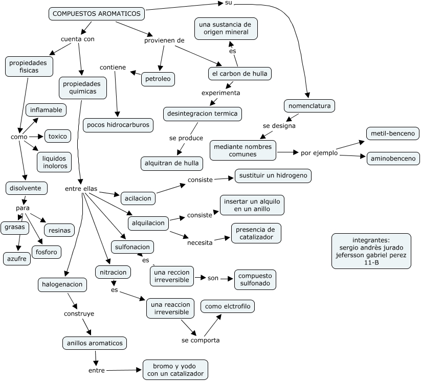 Este Cmap, tiene información relacionada con: compuestos aromaticos, propiedades fisicas como disolvente, mediante nombres comunes por ejemplo aminobenceno, COMPUESTOS AROMATICOS provienen de el carbon de hulla, el carbon de hulla experimenta desintegracion termica, el carbon de hulla es una sustancia de origen mineral, disolvente para azufre, disolvente para resinas, nomenclatura se designa mediante nombres comunes, propiedades fisicas como liquidos inoloros, petroleo contiene pocos hidrocarburos, alquilacion necesita presencia de catalizador, propiedades quimicas entre ellas nitracion, mediante nombres comunes por ejemplo metil-benceno, propiedades quimicas entre ellas sulfonacion, COMPUESTOS AROMATICOS su nomenclatura, propiedades quimicas entre ellas halogenacion, alquilacion consiste insertar un alquilo en un anillo, anillos aromaticos entre bromo y yodo con un catalizador, halogenacion construye anillos aromaticos, sulfonacion es una reccion irreversible