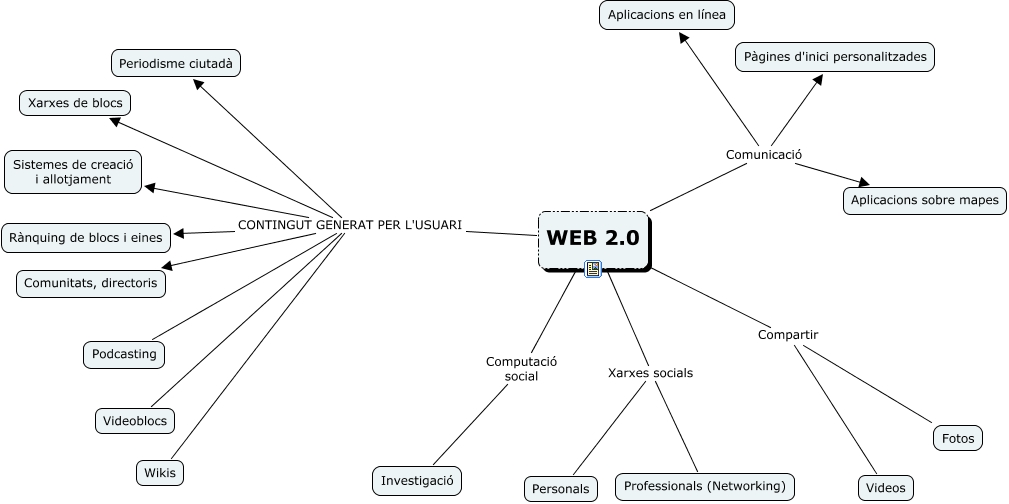 Aquest mapa conceptual conté informació relacionada amb: web 2.0, WEB 2.0 CONTINGUT GENERAT PER L'USUARI Wikis, WEB 2.0 Xarxes socials Professionals (Networking), WEB 2.0 Comunicació Aplicacions sobre mapes, WEB 2.0 CONTINGUT GENERAT PER L'USUARI Comunitats, directoris, WEB 2.0 CONTINGUT GENERAT PER L'USUARI Sistemes de creació i allotjament, WEB 2.0 CONTINGUT GENERAT PER L'USUARI Periodisme ciutadà, WEB 2.0 Xarxes socials Personals, WEB 2.0 CONTINGUT GENERAT PER L'USUARI Xarxes de blocs, WEB 2.0 Comunicació Pàgines d'inici personalitzades, WEB 2.0 CONTINGUT GENERAT PER L'USUARI Rànquing de blocs i eines, WEB 2.0 Compartir Videos, WEB 2.0 Comunicació Aplicacions en línea, WEB 2.0 CONTINGUT GENERAT PER L'USUARI Videoblocs, WEB 2.0 Computació social Investigació, WEB 2.0 Compartir Fotos, WEB 2.0 CONTINGUT GENERAT PER L'USUARI Podcasting