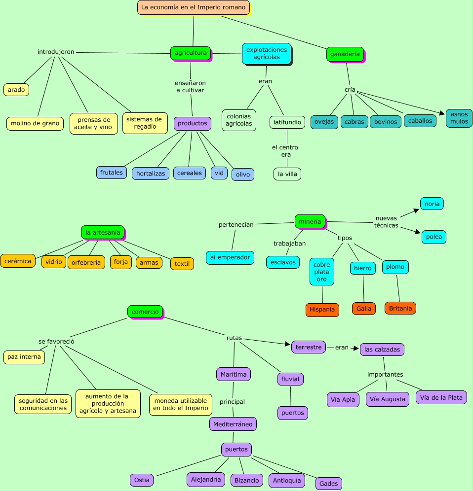 Este Cmap, tiene información relacionada con: La economía en el Imperio romano, comercio rutas terrestre, agricultura ???? explotaciones agrícolas, puertos ???? Antioquía, la artesanía ???? vidrio, comercio rutas fluvial, puertos ???? Gades, ganadería cría ovejas, terrestre eran las calzadas, la artesanía ???? cerámica, las calzadas importantes Vía Apia, latifundio el centro era la villa, la artesanía ???? armas, productos ???? cereales, puertos ???? Bizancio, productos ???? vid, La economía en el Imperio romano ???? agricultura, agricultura enseñaron a cultivar productos, Marítima principal Mediterráneo, ganadería cría caballos, comercio se favoreció moneda utilizable en todo el Imperio