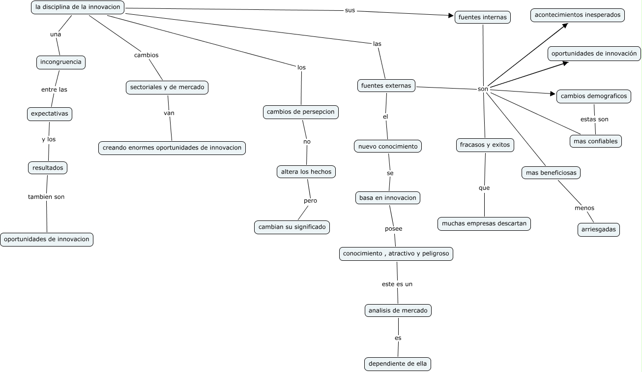 Este Cmap, tiene información relacionada con: innovacion - la disciplina de innovacion, mas confiables son mas beneficiosas, oportunidades de innovación son fracasos y exitos, fuentes externas son acontecimientos inesperados, incongruencia entre las expectativas, fuentes externas el nuevo conocimiento, mas confiables son cambios demograficos, fracasos y exitos que muchas empresas descartan, fuentes externas son fracasos y exitos, altera los hechos pero cambian su significado, acontecimientos inesperados son mas beneficiosas, fuentes externas son oportunidades de innovación, fuentes internas son fracasos y exitos, la disciplina de la innovacion los cambios de persepcion, fuentes internas son cambios demograficos, mas confiables son fracasos y exitos, expectativas y los resultados, la disciplina de la innovacion sus fuentes internas, cambios de persepcion no altera los hechos, cambios demograficos estas son mas confiables, nuevo conocimiento se basa en innovacion