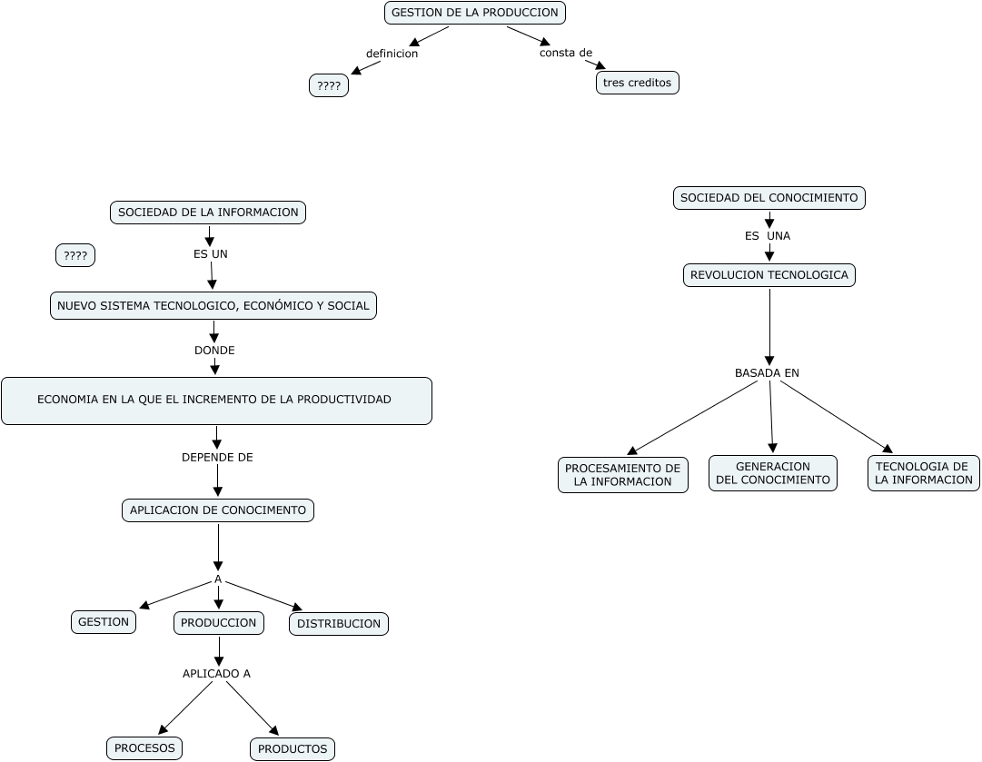 Este Cmap, tiene información relacionada con: SOCIEDAD DE LA INFO Y CONOC, SOCIEDAD DE LA INFORMACION ES UN NUEVO SISTEMA TECNOLOGICO, ECONÓMICO Y SOCIAL, ECONOMIA EN LA QUE EL INCREMENTO DE LA PRODUCTIVIDAD DEPENDE DE APLICACION DE CONOCIMENTO, PRODUCCION APLICADO A PRODUCTOS, GESTION DE LA PRODUCCION definicion ????, GESTION DE LA PRODUCCION consta de tres creditos, REVOLUCION TECNOLOGICA BASADA EN GENERACION DEL CONOCIMIENTO, PRODUCCION APLICADO A PROCESOS, REVOLUCION TECNOLOGICA BASADA EN PROCESAMIENTO DE LA INFORMACION, APLICACION DE CONOCIMENTO A GESTION, SOCIEDAD DEL CONOCIMIENTO ES UNA REVOLUCION TECNOLOGICA, APLICACION DE CONOCIMENTO A DISTRIBUCION, APLICACION DE CONOCIMENTO A PRODUCCION, REVOLUCION TECNOLOGICA BASADA EN TECNOLOGIA DE LA INFORMACION, NUEVO SISTEMA TECNOLOGICO, ECONÓMICO Y SOCIAL DONDE ECONOMIA EN LA QUE EL INCREMENTO DE LA PRODUCTIVIDAD