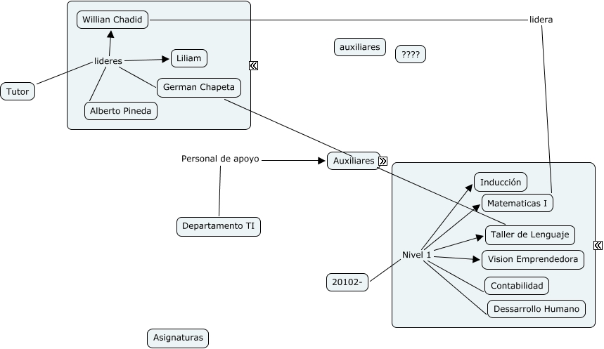 Este Cmap, tiene información relacionada con: Departamento TI, 20102- Nivel 1 Taller de Lenguaje, Willian Chadid lidera Matematicas I, 20102- Nivel 1 Dessarrollo Humano, Departamento TI Personal de apoyo Auxiliares, Tutor lideres Willian Chadid, German Chapeta ???? Taller de Lenguaje, Tutor lideres German Chapeta, Tutor lideres Liliam, 20102- Nivel 1 Inducción, 20102- Nivel 1 Matematicas I, Tutor lideres Alberto Pineda, 20102- Nivel 1 Contabilidad, 20102- Nivel 1 Vision Emprendedora