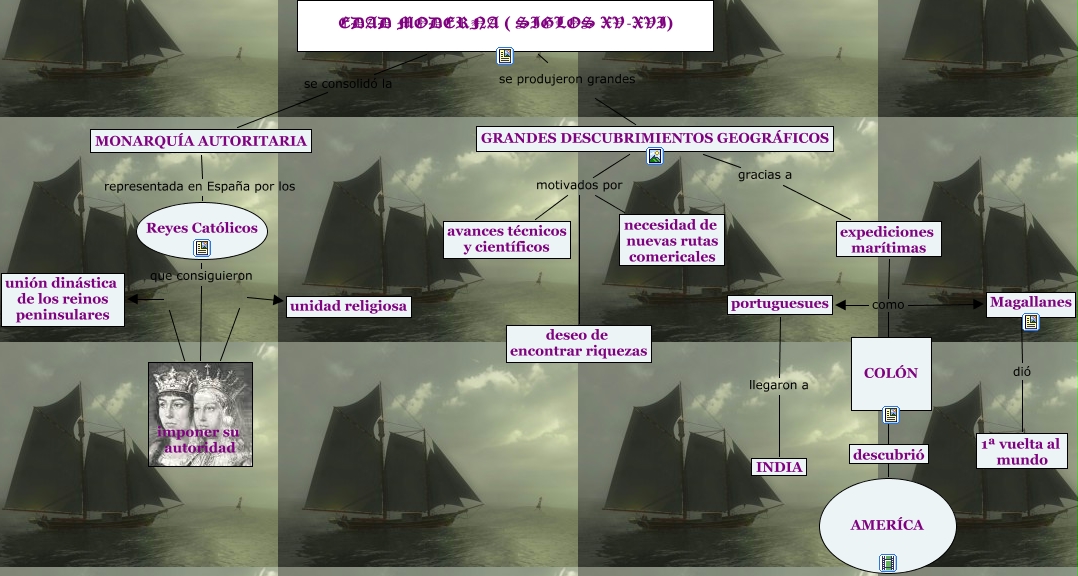 Este Cmap, tiene información relacionada con: edad moderna, expediciones marítimas como portuguesues, portuguesues llegaron a INDIA, GRANDES DESCUBRIMIENTOS GEOGRÁFICOS motivados por necesidad de nuevas rutas comericales, MONARQUÍA AUTORITARIA representada en España por los Reyes Católicos, Reyes Católicos que consiguieron imponer su autoridad, imponer su autoridad unidad religiosa, ???? dió 1ª vuelta al mundo, GRANDES DESCUBRIMIENTOS GEOGRÁFICOS gracias a expediciones marítimas, EDAD MODERNA ( SIGLOS XV-XVI) se consolidó la MONARQUÍA AUTORITARIA, EDAD MODERNA ( SIGLOS XV-XVI) se produjeron grandes GRANDES DESCUBRIMIENTOS GEOGRÁFICOS, expediciones marítimas como Magallanes, GRANDES DESCUBRIMIENTOS GEOGRÁFICOS motivados por deseo de encontrar riquezas, imponer su autoridad unión dinástica de los reinos peninsulares, expediciones marítimas como AMERÍCA, GRANDES DESCUBRIMIENTOS GEOGRÁFICOS motivados por avances técnicos y científicos