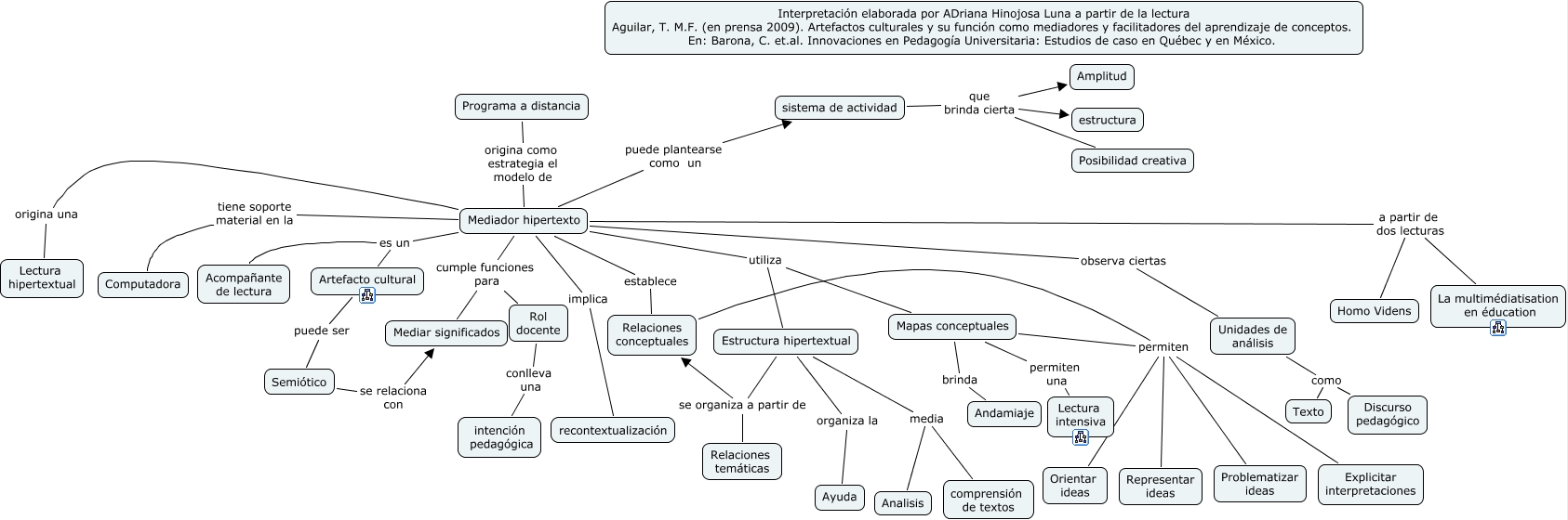 Este Cmap, tiene información relacionada con: Mediador Hipertexto, sistema de actividad que brinda cierta Posibilidad creativa, Mapas conceptuales permiten Explicitar interpretaciones, Mapas conceptuales brinda Andamiaje, Mediador hipertexto a partir de dos lecturas Homo Videns, Semiótico se relaciona con Mediar significados, Mediador hipertexto cumple funciones para Mediar significados, Estructura hipertextual se organiza a partir de Relaciones conceptuales, Estructura hipertextual media Analisis, Estructura hipertextual organiza la Ayuda, Artefacto cultural puede ser Semiótico, Mapas conceptuales permiten Representar ideas, Mediador hipertexto utiliza Estructura hipertextual, Mediador hipertexto tiene soporte material en la Computadora, Estructura hipertextual media comprensión de textos, Rol docente conlleva una intención pedagógica, Mediador hipertexto a partir de dos lecturas La multimédiatisation en éducation, sistema de actividad que brinda cierta estructura, Mediador hipertexto implica recontextualización, Unidades de análisis como Texto, Mapas conceptuales permiten Orientar ideas