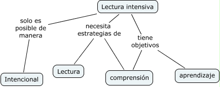 Este Cmap, tiene información relacionada con: Lectura intensiva, Lectura intensiva tiene objetivos comprensión, Lectura intensiva necesita estrategias de Lectura, Lectura intensiva necesita estrategias de comprensión, Lectura intensiva solo es posible de manera Intencional, Lectura intensiva tiene objetivos aprendizaje