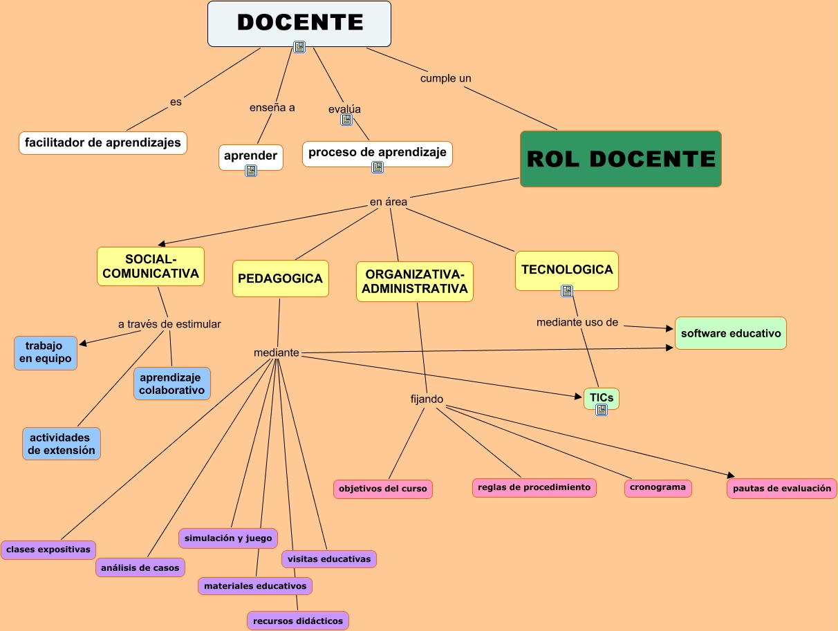 Este Cmap, tiene información relacionada con: Entrega Rol docente, SOCIAL- COMUNICATIVA a través de estimular actividades de extensión, ROL DOCENTE en área ????, ROL DOCENTE en área SOCIAL- COMUNICATIVA, PEDAGOGICA mediante software educativo, DOCENTE es facilitador de aprendizajes, PEDAGOGICA mediante visitas educativas, ORGANIZATIVA- ADMINISTRATIVA fijando cronograma, ORGANIZATIVA- ADMINISTRATIVA fijando pautas de evaluación, ROL DOCENTE en área TECNOLOGICA, ROL DOCENTE en área PEDAGOGICA, TECNOLOGICA mediante uso de software educativo, DOCENTE evalúa proceso de aprendizaje, TECNOLOGICA mediante uso de TICs, SOCIAL- COMUNICATIVA a través de estimular aprendizaje colaborativo, PEDAGOGICA mediante recursos didácticos, PEDAGOGICA mediante análisis de casos, DOCENTE cumple un ROL DOCENTE, ORGANIZATIVA- ADMINISTRATIVA fijando reglas de procedimiento, ORGANIZATIVA- ADMINISTRATIVA fijando objetivos del curso, SOCIAL- COMUNICATIVA a través de estimular trabajo en equipo