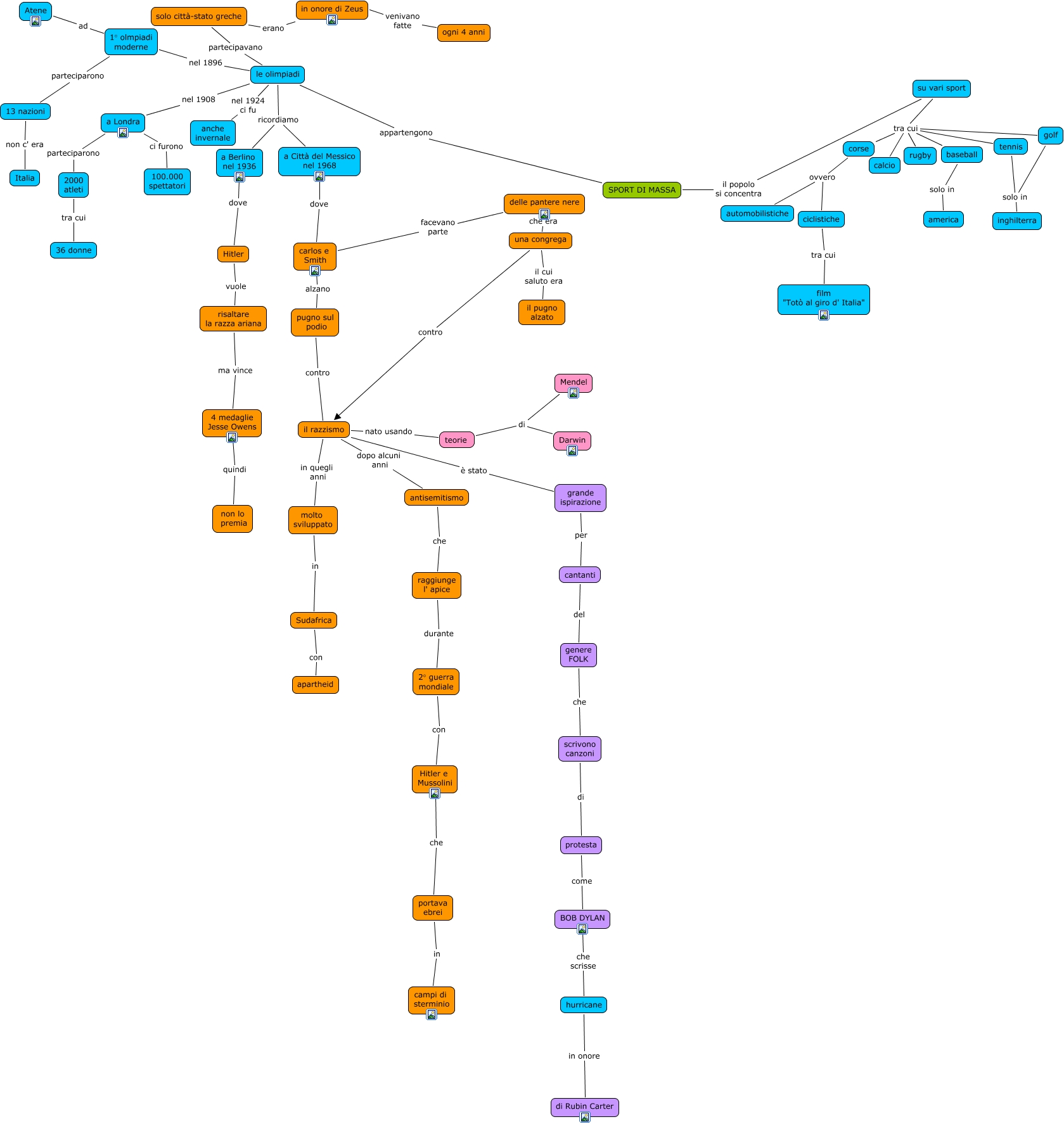 Questa Cmap, creata con IHMC CmapTools, contiene informazioni relative a: le olimpiadi, una congrega il cui saluto era il pugno alzato, ogni 4 anni venivano fatte in onore di Zeus, teorie di Mendel, molto sviluppato in Sudafrica, protesta come BOB DYLAN, 2000 atleti tra cui 36 donne, su vari sport tra cui corse, 1° olmpiadi moderne parteciparono 13 nazioni, le olimpiadi nel 1896 1° olmpiadi moderne, corse ovvero ciclistiche, pugno sul podio contro il razzismo, a Londra ci furono 100.000 spettatori, Hitler vuole risaltare la razza ariana, baseball solo in america, su vari sport tra cui baseball, il razzismo dopo alcuni anni antisemitismo, le olimpiadi appartengono SPORT DI MASSA, scrivono canzoni di protesta, tennis solo in inghilterra, raggiunge l' apice durante 2° guerra mondiale