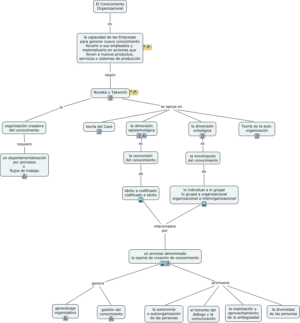 Este Cmap, tiene información relacionada con: 1 Organización y Gestión del Conocimiento, un proceso denominado la espiral de creación de conocimiento genera aprendizaje organizativo, la dimensión ontológica es la movilización del conocimiento, organización creadora del conocimiento requiere un departamentalización por porcesos o flujos de trabajo, un proceso denominado la espiral de creación de conocimiento promueve la autonomía o autoorganización de las personas, El Conocimiento Organizacional es la capacidad de las Empresas para generar nuevo conocimiento llevarlo a sus empleados y materializarlo en acciones que lleven a nuevos productos, servicios o sistemas de producción, Nonaka y Takenchi la organización creadora del conocimiento, un proceso denominado la espiral de creación de conocimiento promueve la explotación y aprovechamiento de la ambigüedad, la conversión del conocimiento de tácito a codificado codificado a tácito, Nonaka y Takenchi se apoya en Teoría de la auto organización, Nonaka y Takenchi se apoya en teoría del Caos, un proceso denominado la espiral de creación de conocimiento genera gestión del conocimiento, la capacidad de las Empresas para generar nuevo conocimiento llevarlo a sus empleados y materializarlo en acciones que lleven a nuevos productos, servicios o sistemas de producción según Nonaka y Takenchi, un proceso denominado la espiral de creación de conocimiento promueve el fomento del diálogo y la comunicación, lo individual a lo grupal lo grupal a organizacional organizacional a interorganizacional relacionados por un proceso denominado la espiral de creación de conocimiento, Nonaka y Takenchi se apoya en la dimensión ontológica, la dimensión epistemológica es la conversión del conocimiento, Nonaka y Takenchi se apoya en la dimensión epistemológica, tácito a codificado codificado a tácito relacionados por un proceso denominado la espiral de creación de conocimiento, un proceso denominado la espiral de creación de conocimiento promueve la diversidad de las personas, la movilización del conocimiento de lo individual a lo grupal lo grupal a organizacional organizacional a interorganizacional