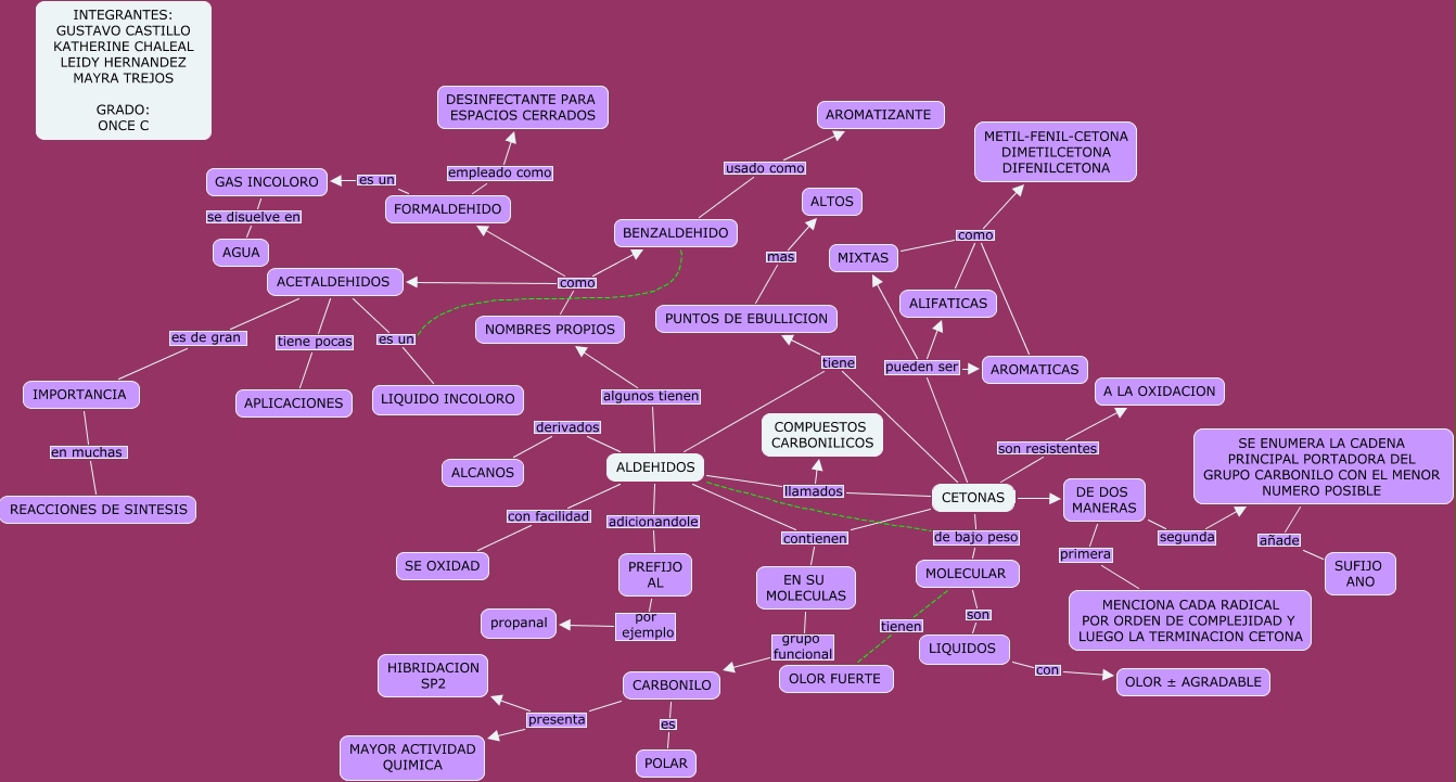 Este Cmap, tiene información relacionada con: CETONAS Y ALDEHIDOS, ALDEHIDOS contienen EN SU MOLECULAS, ALDEHIDOS tiene PUNTOS DE EBULLICION, NOMBRES PROPIOS como BENZALDEHIDO, ALDEHIDOS derivados ALCANOS, NOMBRES PROPIOS como FORMALDEHIDO, NOMBRES PROPIOS como ACETALDEHIDOS, ACETALDEHIDOS es un LIQUIDO INCOLORO, ALDEHIDOS adicionandole PREFIJO AL, ALDEHIDOS llamados COMPUESTOS CARBONILICOS, MOLECULAR tienen OLOR FUERTE, BENZALDEHIDO es un LIQUIDO INCOLORO, ALDEHIDOS algunos tienen NOMBRES PROPIOS, CETONAS tiene PUNTOS DE EBULLICION, SE ENUMERA LA CADENA PRINCIPAL PORTADORA DEL GRUPO CARBONILO CON EL MENOR NUMERO POSIBLE añade SUFIJO ANO, CETONAS pueden ser AROMATICAS, FORMALDEHIDO empleado como DESINFECTANTE PARA ESPACIOS CERRADOS, CETONAS de bajo peso MOLECULAR, CETONAS contienen EN SU MOLECULAS, PUNTOS DE EBULLICION mas ALTOS, ACETALDEHIDOS tiene pocas APLICACIONES