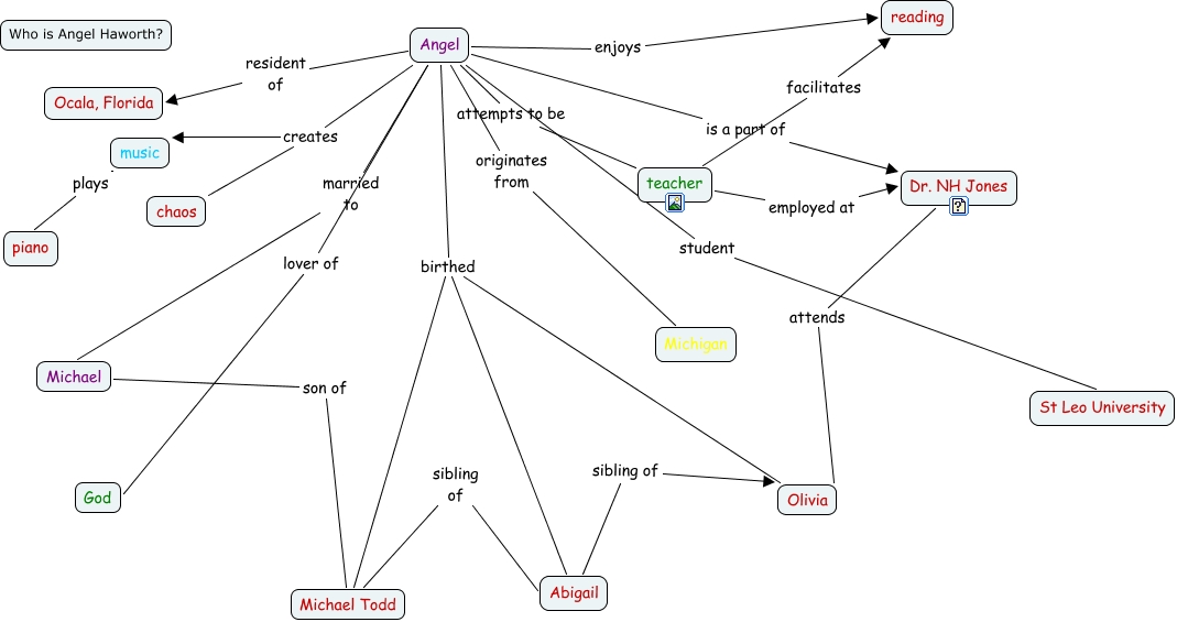 This Concept Map, created with IHMC CmapTools, has information related to: Angel, Michael Todd sibling of Abigail, Angel student St Leo University, Angel birthed Michael Todd, Angel creates music, Angel attempts to be teacher, Abigail sibling of Olivia, Angel lover of God, music plays piano, Angel resident of Ocala, Florida, Dr. NH Jones attends Olivia, teacher facilitates reading, Angel enjoys reading, Abigail birthed Michael Todd, Michael son of Michael Todd, Angel originates from Michigan, Olivia birthed Michael Todd, Angel creates chaos, Angel married to Michael, Angel is a part of Dr. NH Jones, teacher employed at Dr. NH Jones