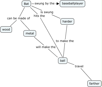 This Concept Map, created with IHMC CmapTools, has information related to: baseball, Bat hits the ball, harder to make the ball, Bat can be made of wood, ball travel farther, Bat can be made of metal, Bat is swung harder, metal will make the ball, Bat swung by the baseballplayer