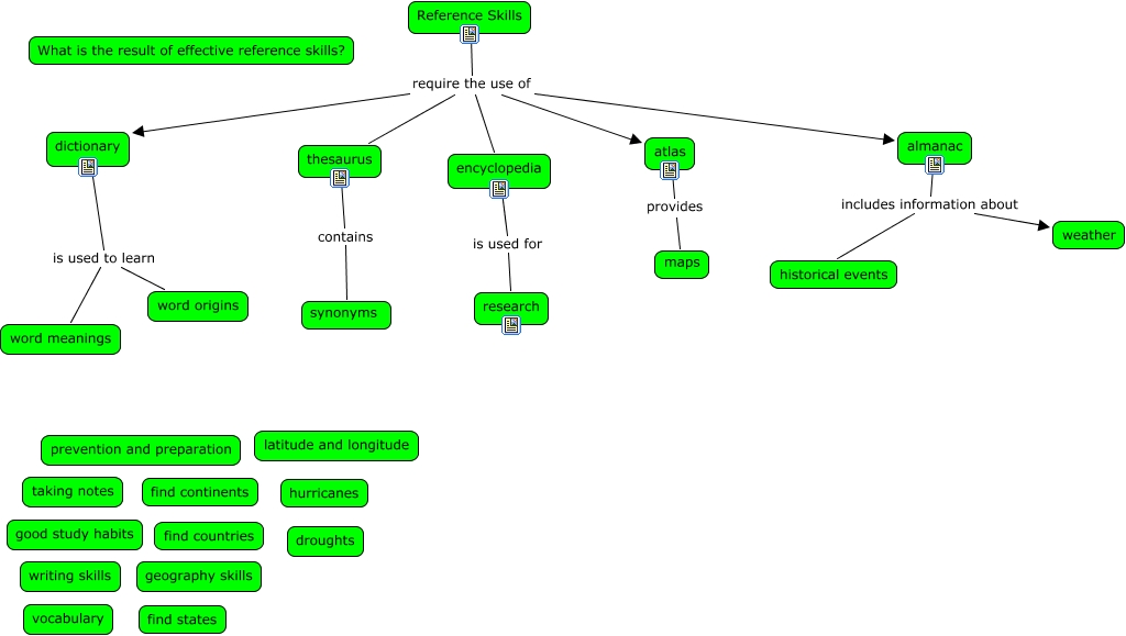 This Concept Map, created with IHMC CmapTools, has information related to: reference skills skeleton map, dictionary is used to learn word origins, dictionary is used to learn word meanings, almanac includes information about weather, Reference Skills require the use of dictionary, almanac includes information about historical events, thesaurus contains synonyms, encyclopedia is used for research, Reference Skills require the use of atlas, atlas provides maps, Reference Skills require the use of almanac, Reference Skills require the use of thesaurus, Reference Skills require the use of encyclopedia