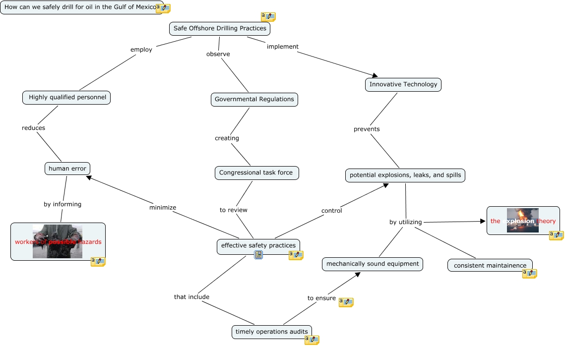 This Concept Map, created with IHMC CmapTools, has information related to: Winneand Ambrose Drilling, potential explosions, leaks, and spills by utilizing mechanically sound equipment, Innovative Technology prevents potential explosions, leaks, and spills, Congressional task force to review effective safety practices, effective safety practices that include timely operations audits, potential explosions, leaks, and spills by utilizing consistent maintainence, Governmental Regulations creating Congressional task force, Safe Offshore Drilling Practices observe Governmental Regulations, human error by informing workers of possible hazards, potential explosions, leaks, and spills by utilizing the explosion theory, effective safety practices minimize human error, Safe Offshore Drilling Practices implement Innovative Technology, Safe Offshore Drilling Practices employ Highly qualified personnel, Highly qualified personnel reduces human error, effective safety practices control potential explosions, leaks, and spills, timely operations audits to ensure mechanically sound equipment