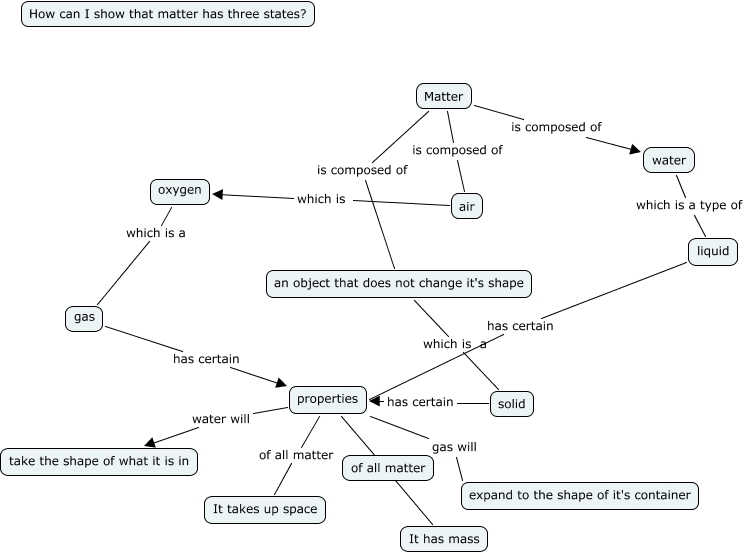 This Concept Map, created with IHMC CmapTools, has information related to: States of Matter, gas has certain properties, properties It has mass, properties water will take the shape of what it is in, solid has certain properties, an object that does not change it's shape which is a solid, properties gas will expand to the shape of it's container, air which is oxygen, water which is a type of liquid, liquid has certain properties, properties of all matter It takes up space, Matter is composed of water, oxygen which is a gas, Matter is composed of an object that does not change it's shape, Matter is composed of air