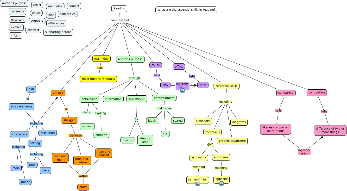 This Concept Map, created with IHMC CmapTools, has information related to: Practice3, plot is story elements, Reading composed of effect, man and himself within story, likeness of two or more things together with difference of two or more things, setting including time, Reading composed of main idea, Reading composed of comparing, conflict is struggle, entertainment making us scared, Reading composed of reference skills, reference skills including graphic organizers, characters including main, struggle between man and man, explanation by how to, author's purpose through explanation, persuasion evoking emotion, story elements including conflict, man and nature within story, cause tells why, author's purpose through entertainment