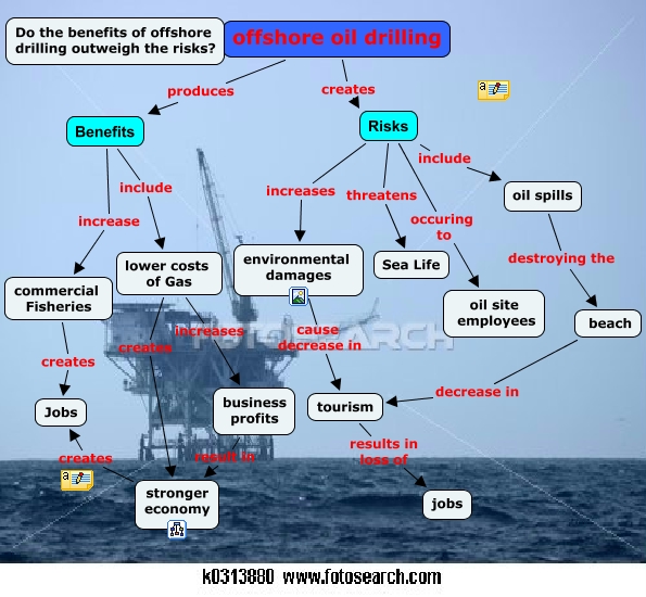 This Concept Map, created with IHMC CmapTools, has information related to: Untitled, Risks occuring to oil site employees, Risks include oil spills, lower costs of Gas increases business profits, tourism results in loss of jobs, environmental damages cause decrease in tourism, Benefits include lower costs of Gas, Risks increases environmental damages, Benefits increase commercial Fisheries, beach decrease in tourism, commercial Fisheries creates Jobs, oil spills destroying the beach, lower costs of Gas creates stronger economy, offshore oil drilling produces Benefits, Risks threatens Sea Life, offshore oil drilling creates Risks, business profits result in stronger economy, stronger economy creates Jobs