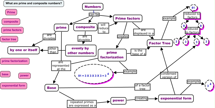 This Concept Map, created with IHMC CmapTools, has information related to: Prime & composite numbers, Numbers can be Prime factors, 9 reduced to factors 3, Base repeated primes are expressed as a power, prime factorization is the base of a Factor Tree, 9 reduced to factors 3, exponential form condensed version of Factor Tree, Numbers can be composite, 9 reduced to factors 3, 81 reduced to factors 9, power creating exponential form, 9 reduced to factors 3, prime are represented at the Base, Prime factors are displayed in a Factor Tree, 9 reduced to factors 3, composite are divisible evenly by other numbers, prime factorization are represented at the Base, exponential form example <math xmlns="http://www.w3.org/1998/Math/MathML"> <mrow> <mtext> 3 </mtext> <mmultiscripts> <mtext> </mtext> <none/> <mtext> 4 </mtext> </mmultiscripts> </mrow> </math>, 9 reduced to factors 3, 9 reduced to factors 3, Numbers can be prime