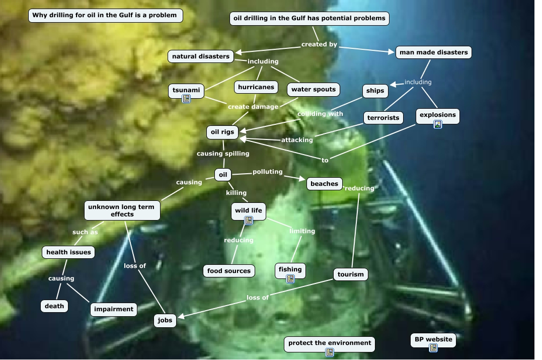This Concept Map, created with IHMC CmapTools, has information related to: oil, natural disasters including tsunami, explosions to oil rigs, health issues causing death, tourism loss of jobs, wild life limiting fishing, natural disasters including water spouts, oil rigs causing spilling oil, man made disasters including terrorists, oil causing unknown long term effects, wild life reducing food sources, man made disasters including ships, oil killing wild life, terrorists attacking oil rigs, beaches reducing tourism, health issues causing impairment, man made disasters including explosions, unknown long term effects loss of jobs, oil drilling in the Gulf has potential problems created by man made disasters, tsunami create damage oil rigs, natural disasters including hurricanes