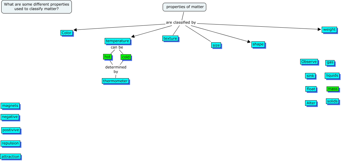 This Concept Map, created with IHMC CmapTools, has information related to: classify matter-skelton, cold determined by thermometer, temperature can be cold, properties of matter are classified by Color, hot determined by thermometer, properties of matter are classified by temperature, properties of matter are classified by size, properties of matter are classified by shape, temperature can be hot, properties of matter are classified by texture, properties of matter are classified by weight