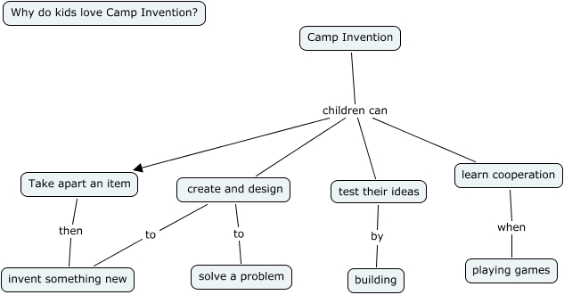 This Concept Map, created with IHMC CmapTools, has information related to: Ambrose, Camp Invention children can learn cooperation, Take apart an item then invent something new, create and design to solve a problem, Camp Invention children can Take apart an item, test their ideas by building, create and design children can test their ideas, create and design to invent something new, create and design children can Take apart an item, create and design children can learn cooperation, Camp Invention children can test their ideas, learn cooperation when playing games