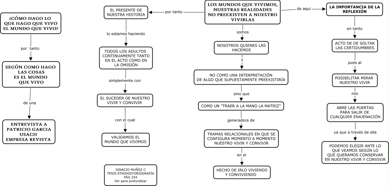 Este Cmap, tiene información relacionada con: NUESTRO MUNDO LO GENERAMOS CON NUESTRO VIVIR Y CONVIVIR, NO COMO UNA INTERPRETACIÓN DE ALGO QUE SUPUESTAMENTE PREEXISTIRÍA sino que COMO UN "TRAER A LA MANO LA MATRIZ", ACTO DE DE SOLTAR LAS CERTIDUMBRES pues al POSIBILITAR MIRAR NUESTRO VIVIR, NOSOTROS QUIENES LAS HACEMOS y NO COMO UNA INTERPRETACIÓN DE ALGO QUE SUPUESTAMENTE PREEXISTIRÍA, TODOS LOS ADULTOS CONTINUAMENTE TANTO EN EL ACTO COMO EN LA OMISIÓN simplemente con EL SUCEDER DE NUESTRO VIVIR Y CONVIVIR, COMO UN "TRAER A LA MANO LA MATRIZ" generadora de TRAMAS RELACIONALES EN QUE SE CONFIGURA MOMENTO A MOMENTO NUESTRO VIVIR Y CONVIVIR, LA IMPORTANCIA DE LA REFLEXIÓN en tanto ACTO DE DE SOLTAR LAS CERTIDUMBRES, EL PRESENTE DE NUESTRA HISTORIA lo estamos haciendo TODOS LOS ADULTOS CONTINUAMENTE TANTO EN EL ACTO COMO EN LA OMISIÓN, LOS MUNDOS QUE VIVIMOS, NUESTRAS REALIDADES NO PREEXISTEN A NUESTRO VIVIRLAS somos NOSOTROS QUIENES LAS HACEMOS, TRAMAS RELACIONALES EN QUE SE CONFIGURA MOMENTO A MOMENTO NUESTRO VIVIR Y CONVIVIR en el HECHO DE IRLO VIVIENDO Y CONVIVIENDO, SEGÚN COMO HAGO LAS COSAS ES EL MUNDO QUE VIVO de una ENTREVISTA A PATRICIO GARCIA USACH EMPRESA REVISTA, LOS MUNDOS QUE VIVIMOS, NUESTRAS REALIDADES NO PREEXISTEN A NUESTRO VIVIRLAS de aqui LA IMPORTANCIA DE LA REFLEXIÓN, EL SUCEDER DE NUESTRO VIVIR Y CONVIVIR con el cual VALIDAMOS EL MUNDO QUE VIVIMOS, POSIBILITAR MIRAR NUESTRO VIVIR nos ABRE LAS PUERTAS PARA SALIR DE CUALQUIER ENAJENACIÓN, ¿CÓMO HAGO LO QUE HAGO QUE VIVO EL MUNDO QUE VIVO? por tanto SEGÚN COMO HAGO LAS COSAS ES EL MUNDO QUE VIVO, ABRE LAS PUERTAS PARA SALIR DE CUALQUIER ENAJENACIÓN ya que a través de ella PODEMOS ELEGIR ANTE LO QUE VEAMOS SEGÚN LO QUE QUERAMOS CONSERVAR EN NUESTRO VIVIR Y CONVIVIR, LOS MUNDOS QUE VIVIMOS, NUESTRAS REALIDADES NO PREEXISTEN A NUESTRO VIVIRLAS por tanto EL PRESENTE DE NUESTRA HISTORIA