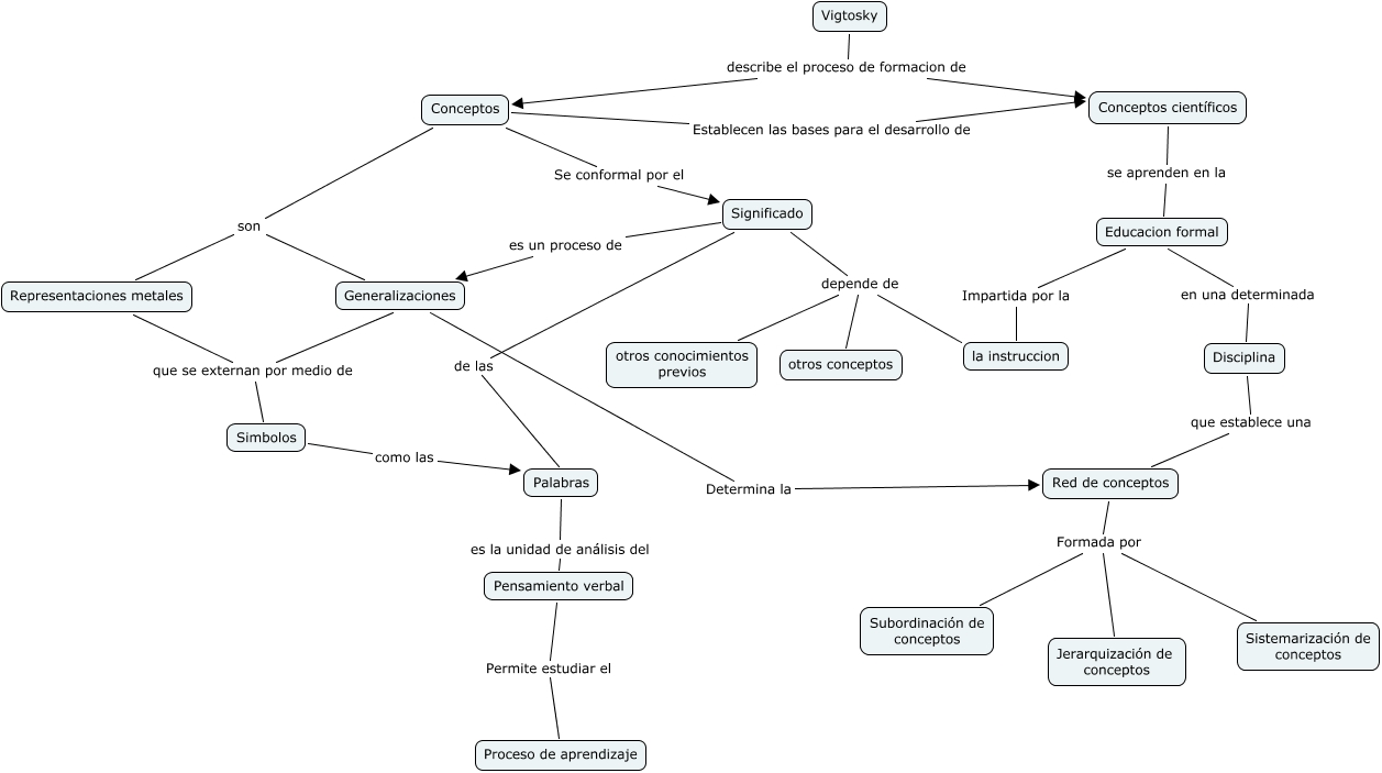 Este Cmap, tiene información relacionada con: Concepto científico Vigotsky, Pensamiento verbal Permite estudiar el Proceso de aprendizaje, Significado depende de otros conocimientos previos, Conceptos Se conformal por el Significado, Significado de las Palabras, Significado es un proceso de Generalizaciones, Significado depende de otros conceptos, Red de conceptos Formada por Jerarquización de conceptos, Representaciones metales que se externan por medio de Simbolos, Vigtosky describe el proceso de formacion de Conceptos científicos, Red de conceptos Formada por Subordinación de conceptos, Generalizaciones que se externan por medio de Simbolos, Conceptos son Generalizaciones, Palabras es la unidad de análisis del Pensamiento verbal, Conceptos Establecen las bases para el desarrollo de Conceptos científicos, Educacion formal en una determinada Disciplina, Red de conceptos Formada por Sistemarización de conceptos, Disciplina que establece una Red de conceptos, Significado depende de la instruccion, Educacion formal Impartida por la la instruccion, Simbolos como las Palabras
