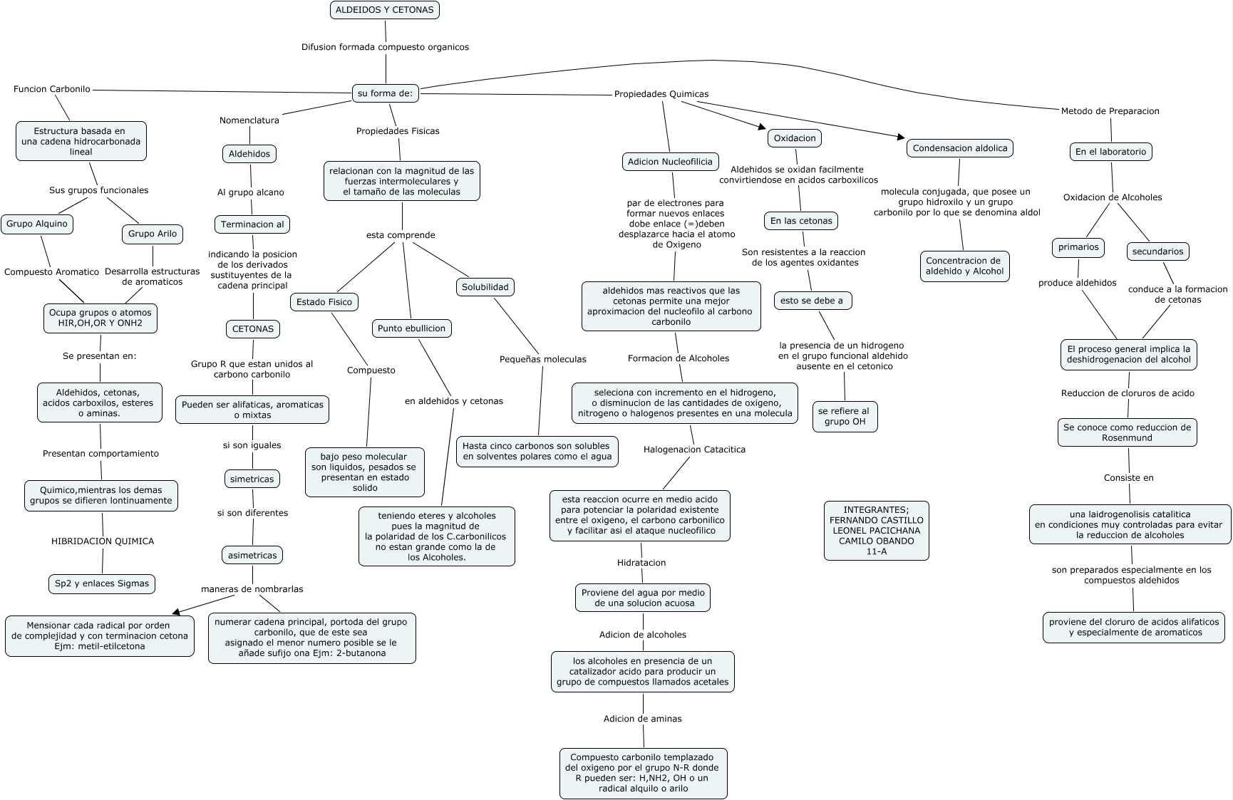 Este Cmap, tiene información relacionada con: quimica, Estado Fisico Compuesto bajo peso molecular son liquidos, pesados se presentan en estado solido, relacionan con la magnitud de las fuerzas intermoleculares y el tamaño de las moleculas esta comprende Punto ebullicion, su forma de: Propiedades Quimicas Condensacion aldolica, su forma de: Propiedades Fisicas relacionan con la magnitud de las fuerzas intermoleculares y el tamaño de las moleculas, una laidrogenolisis catalitica en condiciones muy controladas para evitar la reduccion de alcoholes son preparados especialmente en los compuestos aldehidos proviene del cloruro de acidos alifaticos y especialmente de aromaticos, Aldehidos, cetonas, acidos carboxilos, esteres o aminas. Presentan comportamiento Quimico,mientras los demas grupos se difieren lontinuamente, esto se debe a la presencia de un hidrogeno en el grupo funcional aldehido ausente en el cetonico se refiere al grupo OH, seleciona con incremento en el hidrogeno, o disminucion de las cantidades de oxigeno, nitrogeno o halogenos presentes en una molecula Halogenacion Catacitica esta reaccion ocurre en medio acido para potenciar la polaridad existente entre el oxigeno, el carbono carbonilico y facilitar asi el ataque nucleofilico, Grupo Alquino Compuesto Aromatico Ocupa grupos o atomos HIR,OH,OR Y ONH2, En las cetonas Son resistentes a la reaccion de los agentes oxidantes esto se debe a, su forma de: Propiedades Quimicas Adicion Nucleofilicia, Se conoce como reduccion de Rosenmund Consiste en una laidrogenolisis catalitica en condiciones muy controladas para evitar la reduccion de alcoholes, su forma de: Propiedades Quimicas Oxidacion, En el laboratorio Oxidacion de Alcoholes secundarios, Terminacion al indicando la posicion de los derivados sustituyentes de la cadena principal CETONAS, Estructura basada en una cadena hidrocarbonada lineal Sus grupos funcionales Grupo Arilo, Grupo Arilo Desarrolla estructuras de aromaticos ????, Estructura basada en una cadena hidrocarbonada lineal Sus grupos funcionales Grupo Alquino, Pueden ser alifaticas, aromaticas o mixtas si son iguales simetricas, Solubilidad Pequeñas moleculas Hasta cinco carbonos son solubles en solventes polares como el agua