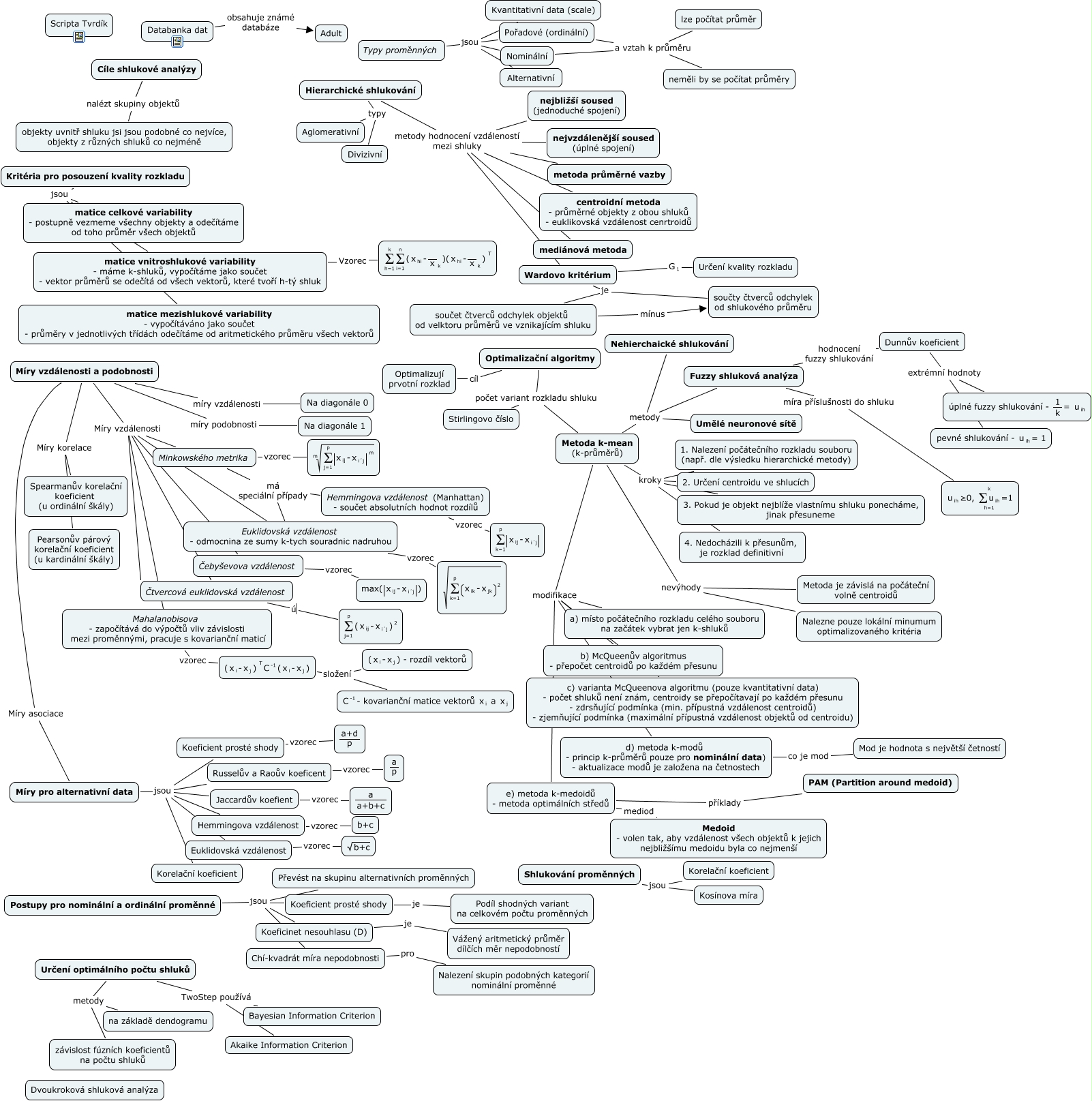 Tato Cmapa, vytvořená pomocí CmapTools, obsahuje informaci související s: dSMM, Metoda k-mean (k-průměrů) nevýhody Metoda je závislá na počáteční volně centroidů, Určení optimálního počtu shluků TwoStep používá Bayesian Information Criterion, Optimalizační algoritmy počet variant rozkladu shluku Metoda k-mean (k-průměrů), Určení optimálního počtu shluků metody závislost fúzních koeficientů na počtu shluků, Postupy pro nominální a ordinální proměnné jsou Koeficinet nesouhlasu (D), Kritéria pro posouzení kvality rozkladu jsou matice mezishlukové variability - vypočítáváno jako součet - průměry v jednotlivých třídách odečítáme od aritmetického průměru všech vektorů, Fuzzy shluková analýza hodnocení fuzzy shlukování Dunnův koeficient, Shlukování proměnných jsou Korelační koeficient, Míry vzdálenosti a podobnosti Míry vzdálenosti Čebyševova vzdálenost, Minkowského metrika má speciální případy Euklidovská vzdálenost - odmocnina ze sumy k-tych souradnic nadruhou, Metoda k-mean (k-průměrů) modifikace e) metoda k-medoidů - metoda optimálních středů, Dunnův koeficient extrémní hodnoty <math xmlns="http://www.w3.org/1998/Math/MathML"> <mrow> <mtext> úplné fuzzy shlukování - </mtext> <mfrac> <mtext> 1 </mtext> <mtext> k </mtext> </mfrac> <mtext> = </mtext> <mmultiscripts> <mtext> u </mtext> <mtext> ih </mtext> <none/> </mmultiscripts> </mrow> </math>, Čebyševova vzdálenost vzorec <math xmlns="http://www.w3.org/1998/Math/MathML"> <mrow> <mtext> max( </mtext> <mfenced open="|" close="|"> <mmultiscripts> <mtext> x </mtext> <mtext> ij </mtext> <none/> </mmultiscripts> <mtext> - </mtext> <mmultiscripts> <mtext> x </mtext> <mtext> i´j </mtext> <none/> </mmultiscripts> </mfenced> <mtext> ) </mtext> </mrow> </math>, Míry vzdálenosti a podobnosti Míry vzdálenosti Čtvercová euklidovská vzdálenost, Určení optimálního počtu shluků TwoStep používá Akaike Information Criterion, Kritéria pro posouzení kvality rozkladu jsou matice vnitroshlukové variability - máme k-shluků, vypočítáme jako součet - vektor průměrů se odečítá od všech vektorů, které tvoří h-tý shluk, Míry vzdálenosti a podobnosti Míry vzdálenosti Mahalanobisova - započítává do výpočtů vliv závislosti mezi proměnnými, pracuje s kovarianční maticí, Typy proměnných jsou Alternativní, Hierarchické shlukování metody hodnocení vzdáleností mezi shluky centroidní metoda - průměrné objekty z obou shluků - euklikovská vzdálenost cenrtroidů, Mahalanobisova - započítává do výpočtů vliv závislosti mezi proměnnými, pracuje s kovarianční maticí vzorec <math xmlns="http://www.w3.org/1998/Math/MathML"> <mrow> <mtext> ( </mtext> <mmultiscripts> <mtext> x </mtext> <mtext> i </mtext> <none/> </mmultiscripts> <mtext> - </mtext> <mmultiscripts> <mtext> x </mtext> <mtext> j </mtext> <none/> </mmultiscripts> <mtext> ) </mtext> <mmultiscripts> <mtext> </mtext> <none/> <mtext> T </mtext> </mmultiscripts> <mmultiscripts> <mtext> C </mtext> <none/> <mtext> -1 </mtext> </mmultiscripts> <mtext> ( </mtext> <mmultiscripts> <mtext> x </mtext> <mtext> i </mtext> <none/> </mmultiscripts> <mtext> - </mtext> <mmultiscripts> <mtext> x </mtext> <mtext> j </mtext> <none/> </mmultiscripts> <mtext> ) </mtext> </mrow> </math>