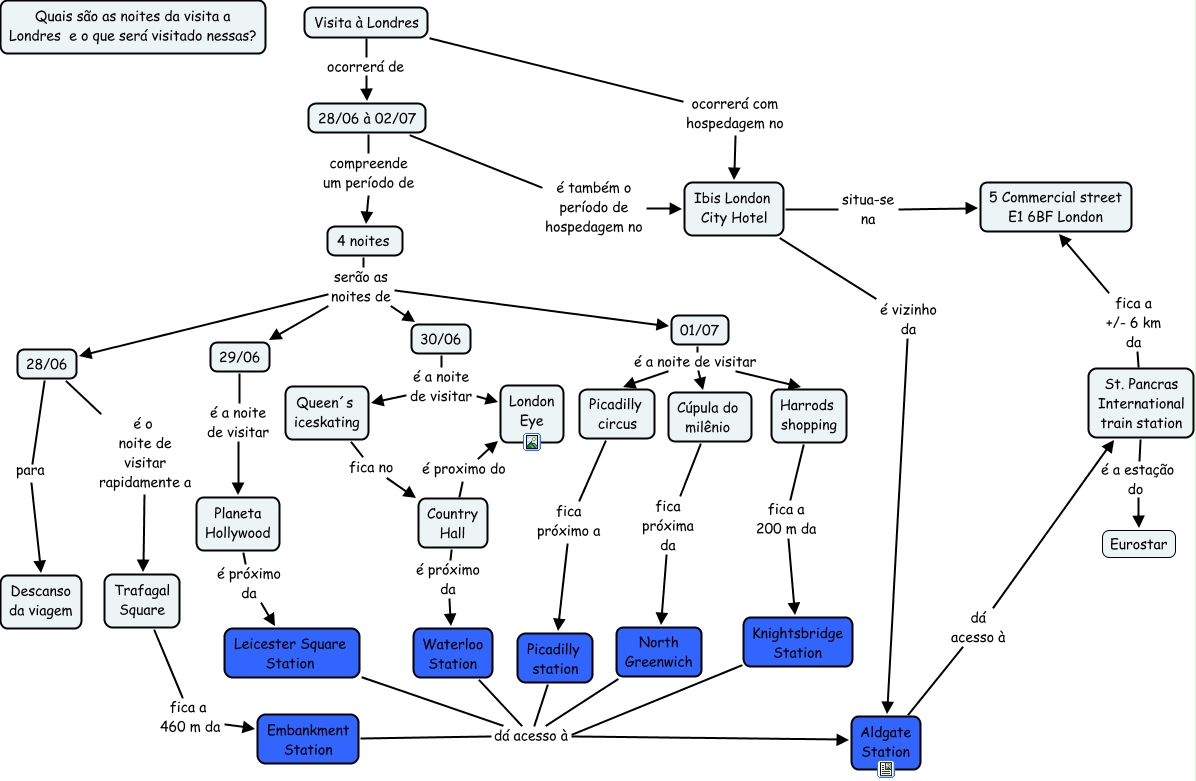This Concept Map, created with IHMC CmapTools, has information related to: London Noite, 30/06 é a noite de visitar London Eye, 28/06 para Descanso da viagem, Waterloo Station dá acesso à Aldgate Station, Ibis London City Hotel é vizinho da Aldgate Station, 28/06 à 02/07 compreende um período de 4 noites, Harrods shopping fica a 200 m da Knightsbridge Station, 4 noites serão as noites de 29/06, Trafagal Square fica a 460 m da Embankment Station, Ibis London City Hotel situa-se na 5 Commercial street E1 6BF London, 28/06 é o noite de visitar rapidamente a Trafagal Square, Leicester Square Station dá acesso à Aldgate Station, Picadilly station dá acesso à Aldgate Station, 4 noites serão as noites de 28/06, 4 noites serão as noites de 01/07, Cúpula do milênio fica próxima da North Greenwich, 01/07 é a noite de visitar Picadilly circus, Planeta Hollywood é próximo da Leicester Square Station, 01/07 é a noite de visitar Cúpula do milênio, Knightsbridge Station dá acesso à Aldgate Station, Visita à Londres ocorrerá de 28/06 à 02/07