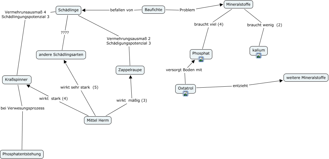 Dieses mit IHMC CmapTools erstellte CMap hat Informationen bezüglich: ExperteB, Mineralstoffe braucht viel (4) Phosphat, Mineralstoffe braucht wenig (2) kalium, Kraßspinner bei Verwesungsprozess Phosphatentstehung, Mittel Herm wirkt mäßig (3) Zappelraupe, Mittel Herm wirkt stark (4) Kraßspinner, Schädlinge Vermehrunsausmaß 4 Schädlingungspotenzial 3 Kraßspinner, Oxtatrol versorgt Boden mit Phosphat, Oxtatrol entzieht weitere Mineralstoffe, Schädlinge ???? andere Schädlingsarten, Schädlinge Vermehrungsausmaß 2 Schädigungspotenzial 3 Zappelraupe, Baufichte befallen von Schädlinge, Mittel Herm wirkt sehr stark (5) andere Schädlingsarten, Baufichte Problem Mineralstoffe