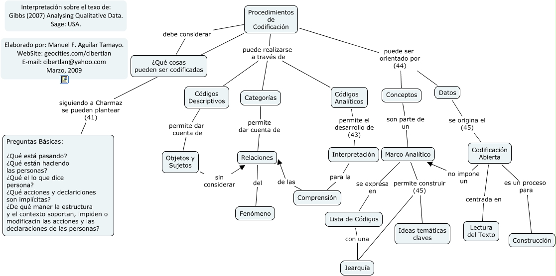Este Cmap, tiene información relacionada con: Procedimienos de Codificación, Relaciones del Fenómeno, Codificación Abierta no impone un Marco Analítico, Procedimientos de Codificación puede realizarse a través de Códigos Analíticos, Lista de Códigos con una Jearquía, Codificación Abierta es un proceso para Construcción, Códigos Descriptivos permite dar cuenta de Objetos y Sujetos, Marco Analítico se expresa en Lista de Códigos, Interpretación para la Comprensión, Procedimientos de Codificación puede realizarse a través de Categorías, Codificación Abierta centrada en Lectura del Texto, Procedimientos de Codificación puede ser orientado por (44) Datos, Códigos Analíticos permite el desarrollo de (43) Interpretación, Objetos y Sujetos sin considerar Relaciones, Procedimientos de Codificación puede ser orientado por (44) Conceptos, Procedimientos de Codificación siguiendo a Charmaz se pueden plantear (41) Preguntas Básicas: ¿Qué está pasando? ¿Qué están haciendo las personas? ¿Qué el lo que dice persona? ¿Qué acciones y declariciones son implícitas? ¿De qué maner la estructura y el contexto soportan, impiden o modificacin las acciones y las declaraciones de las personas?, Marco Analítico permite construir (45) Jearquía, Comprensión de las Relaciones, Marco Analítico permite construir (45) Ideas temáticas claves, Procedimientos de Codificación puede realizarse a través de Códigos Descriptivos, Conceptos son parte de un Marco Analítico