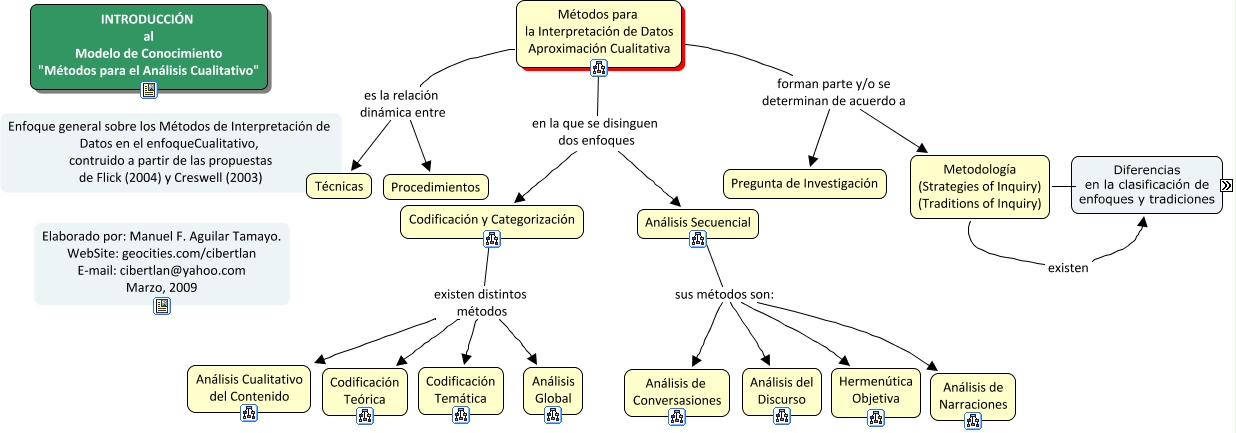 Este Cmap, tiene información relacionada con: Métodos para la Interpretación de Datos, Análisis Secuencial sus métodos son: Análisis de Conversasiones, Métodos para la Interpretación de Datos Aproximación Cualitativa forman parte y/o se determinan de acuerdo a Metodología (Strategies of Inquiry) (Traditions of Inquiry), Metodología (Strategies of Inquiry) (Traditions of Inquiry) según Flick (2004) se distinguen como (32) Enfoques de Investigación, Strategies of Inquiry estos son Teoría Fundamentada, Metodología (Strategies of Inquiry) (Traditions of Inquiry) según Creswell (2003) se distinguen como (13) Strategies of Inquiry, Codificación y Categorización existen distintos métodos Análisis Cualitativo del Contenido, Enfoques de Investigación estos son Estrucuturalismo o Psicolanlíticas, Strategies of Inquiry estos son Narrativas, Análisis Secuencial sus métodos son: Análisis del Discurso, Enfoques de Investigación estos son Interaccionismo Simbólico, Strategies of Inquiry estos son Etnomedotología (Etnografía), Enfoques de Investigación estos son Etnomedotología (Etnografía), Metodología (Strategies of Inquiry) (Traditions of Inquiry) existen Diferencias en la clasificación de enfoques y tradiciones, Codificación y Categorización existen distintos métodos Análisis Global, Métodos para la Interpretación de Datos Aproximación Cualitativa forman parte y/o se determinan de acuerdo a Pregunta de Investigación, Métodos para la Interpretación de Datos Aproximación Cualitativa es la relación dinámica entre Procedimientos, Métodos para la Interpretación de Datos Aproximación Cualitativa en la que se disinguen dos enfoques Codificación y Categorización, Strategies of Inquiry estos son Fenomenología, Métodos para la Interpretación de Datos Aproximación Cualitativa en la que se disinguen dos enfoques Análisis Secuencial, Strategies of Inquiry estos son Estudios de Caso