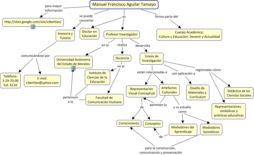 Este Cmap, tiene información relacionada con: PresentacionManuel, Manuel Francisco Aguilar Tamayo forma parte del Cuerpo Académico: Cultura y Educación: Devenir y Actualidad, Lineas de Investigación registradas cómo Didáctica de las Ciencias Sociales, Representación Visual-Conceptual de Conocimiento, Representación Visual-Conceptual de Conceptos, Artefactos Culturales y su estudio como Mediadores del Aprendizaje, Lineas de Investigación están relacionadas a Representación Visual-Conceptual, Facultad de Comunicación Humana pertencen a la Universidad Autónoma del Estado de Morelos, Instituto de Ciencias de la Educación pertencen a la Universidad Autónoma del Estado de Morelos, Asesoría y Tutoria comunicándose por E-mail: cibertlan@yahoo.com, Docencia en el Instituto de Ciencias de la Educación, Artefactos Culturales y su estudio como Mediadores Semióticos, Asesoría y Tutoria comunicándose por Teléfono: 3-29-70-00 Ext. 6110, Profesor Investigador realiza Docencia, Manuel Francisco Aguilar Tamayo para mayor información http://sites.google.com/site/cibertlan/, Lineas de Investigación con aplicación a Diseño de Materiales y Currículum, Mediadores Semióticos para la construcción, comunicaicón y preservación Conocimiento, Profesor Investigador en la Universidad Autónoma del Estado de Morelos, Lineas de Investigación están relacionadas a Artefactos Culturales, Profesor Investigador desarrolla Lineas de Investigación, Manuel Francisco Aguilar Tamayo es Doctor en Educación
