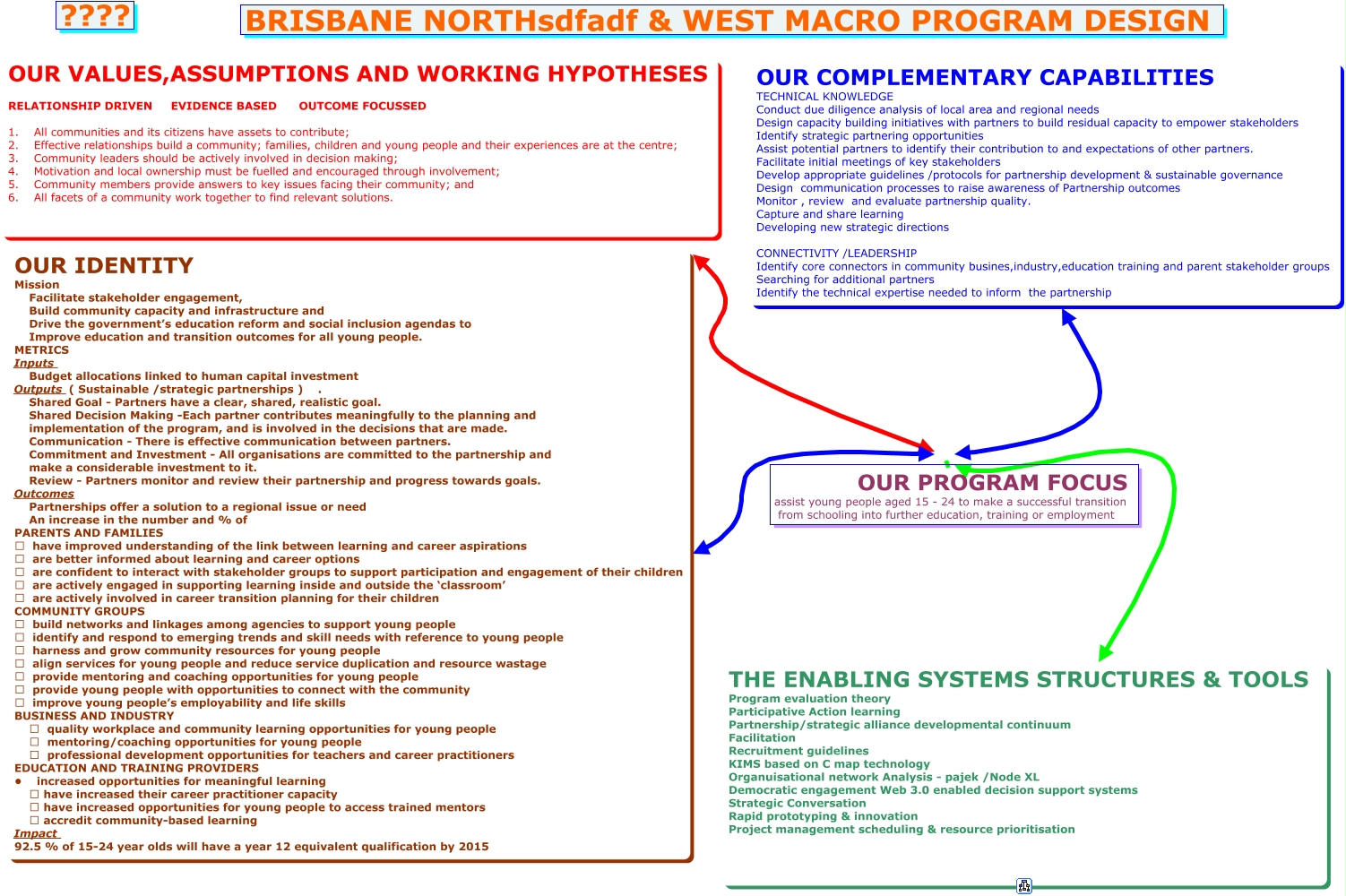 This Concept Map, created with IHMC CmapTools, has information related to: BN & W PB MACRO DESIGN, THE ENABLING SYSTEMS STRUCTURES & TOOLS Program evaluation theory Participative Action learning Partnership/strategic alliance developmental continuum Facilitation Recruitment guidelines KIMS based on C map technology Organuisational network Analysis - pajek /Node XL Democratic engagement Web 3.0 enabled decision support systems Strategic Conversation Rapid prototyping & innovation Project management scheduling & resource prioritisation OUR COMPLEMENTARY CAPABILITIES TECHNICAL KNOWLEDGE Conduct due diligence analysis of local area and regional needs Design capacity building initiatives with partners to build residual capacity to empower stakeholders Identify strategic partnering opportunities Assist potential partners to identify their contribution to and expectations of other partners. Facilitate initial meetings of key stakeholders Develop appropriate guidelines /protocols for partnership development & sustainable governance Design communication processes to raise awareness of Partnership outcomes Monitor , review and evaluate partnership quality. Capture and share learning Developing new strategic directions CONNECTIVITY /LEADERSHIP Identify core connectors in community busines,industry,education training and parent stakeholder groups Searching for additional partners Identify the technical expertise needed to inform the partnership, THE ENABLING SYSTEMS STRUCTURES & TOOLS Program evaluation theory Participative Action learning Partnership/strategic alliance developmental continuum Facilitation Recruitment guidelines KIMS based on C map technology Organuisational network Analysis - pajek /Node XL Democratic engagement Web 3.0 enabled decision support systems Strategic Conversation Rapid prototyping & innovation Project management scheduling & resource prioritisation OUR IDENTITY Mission Facilitate stakeholder engagement, Build community capacity and infrastructure and Drive the government’s education reform and social inclusion agendas to Improve education and transition outcomes for all young people. METRICS Inputs Budget allocations linked to human capital investment Outputs ( Sustainable /strategic partnerships ) . Shared Goal - Partners have a clear, shared, realistic goal. Shared Decision Making -Each partner contributes meaningfully to the planning and implementation of the program, and is involved in the decisions that are made. Communication - There is effective communication between partners. Commitment and Investment - All organisations are committed to the partnership and make a considerable investment to it. Review - Partners monitor and review their partnership and progress towards goals. Outcomes Partnerships offer a solution to a regional issue or need An increase in the number and % of PARENTS AND FAMILIES have improved understanding of the link between learning and career aspirations are better informed about learning and career options are confident to interact with stakeholder groups to support participation and engagement of their children are actively engaged in supporting learning inside and outside the ‘classroom’ are actively involved in career transition planning for their children COMMUNITY GROUPS build networks and linkages among agencies to support young people identify and respond to emerging trends and skill needs with reference to young people harness and grow community resources for young people align services for young people and reduce service duplication and resource wastage provide mentoring and coaching opportunities for young people provide young people with opportunities to connect with the community improve young people’s employability and life skills BUSINESS AND INDUSTRY quality workplace and community learning opportunities for young people mentoring/coaching opportunities for young people professional development opportunities for teachers and career practitioners EDUCATION AND TRAINING PROVIDERS • increased opportunities for meaningful learning have increased their career practitioner capacity have increased opportunities for young people to access trained mentors accredit community-based learning Impact 92.5 % of 15-24 year olds will have a year 12 equivalent qualification by 2015, THE ENABLING SYSTEMS STRUCTURES & TOOLS Program evaluation theory Participative Action learning Partnership/strategic alliance developmental continuum Facilitation Recruitment guidelines KIMS based on C map technology Organuisational network Analysis - pajek /Node XL Democratic engagement Web 3.0 enabled decision support systems Strategic Conversation Rapid prototyping & innovation Project management scheduling & resource prioritisation OUR IDENTITY Mission Facilitate stakeholder engagement, Build community capacity and infrastructure and Drive the government’s education reform and social inclusion agendas to Improve education and transition outcomes for all young people. METRICS Inputs Budget allocations linked to human capital investment Outputs ( Sustainable /strategic partnerships ) . Shared Goal - Partners have a clear, shared, realistic goal. Shared Decision Making -Each partner contributes meaningfully to the planning and implementation of the program, and is involved in the decisions that are made. Communication - There is effective communication between partners. Commitment and Investment - All organisations are committed to the partnership and make a considerable investment to it. Review - Partners monitor and review their partnership and progress towards goals. Outcomes Partnerships offer a solution to a regional issue or need An increase in the number and % of PARENTS AND FAMILIES have improved understanding of the link between learning and career aspirations are better informed about learning and career options are confident to interact with stakeholder groups to support participation and engagement of their children are actively engaged in