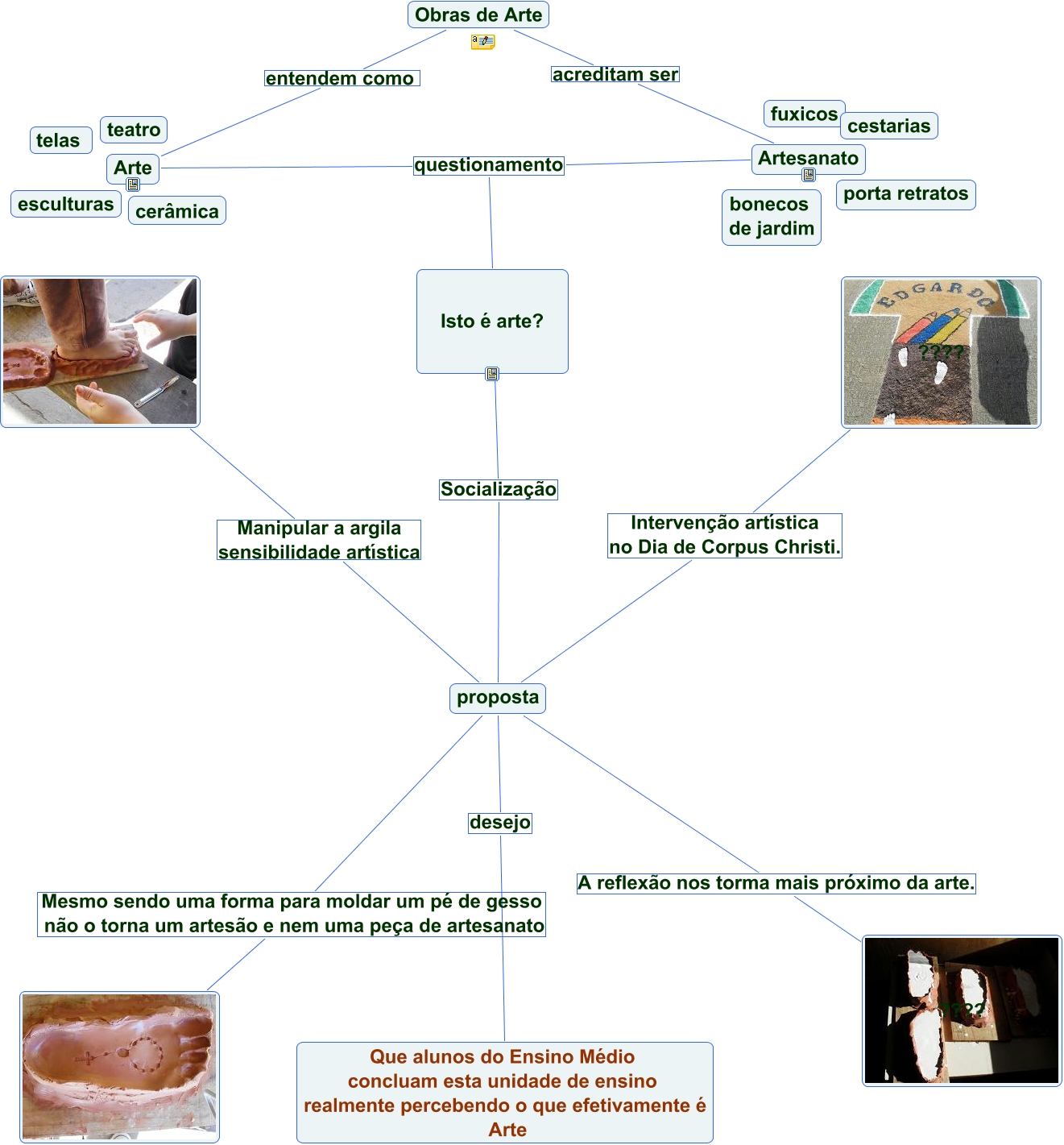 Esse mapa conceitual, produzido no IHMC CmapTools, tem a informação relacionada a: seminario3, Arte questionamento Isto é arte?, Isto é arte? Socialização proposta, proposta Manipular a argila sensibilidade artística, Obras de Arte entendem como Arte, Obras de Arte acreditam ser Artesanato, proposta Mesmo sendo uma forma para moldar um pé de gesso não o torna um artesão e nem uma peça de artesanato, Arte questionamento Artesanato, proposta Intervenção artística no Dia de Corpus Christi. ????, proposta desejo Que alunos do Ensino Médio concluam esta unidade de ensino realmente percebendo o que efetivamente é Arte, proposta A reflexão nos torma mais próximo da arte. ????