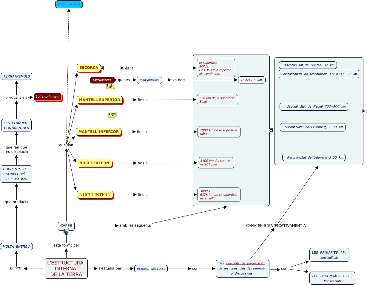 Este Cmap, tiene información relacionada con: L'ENERGIA INTERNA DEL PLANETA, CAPES que son MANTELL INFERIOR, MANTELL SUPERIOR fins a 670 km de la superfície Sólid, CORRENTS DE CONVECCIÓ DEL MAGMA que fan que es desplacin LES PLAQUES CONTINENTALS, CAPES amb les següents CARACTERÍSTIQUES, L'ESTRUCTURA INTERNA DE LA TERRA s'estudia per MÈTODES INDIRECTES, molt plàstica va dels 75 als 100 km, MÈTODES INDIRECTES com les velocitats de propagació de les ones dels terratremols o d'explosions, NUCLI EXTERN fins a 5100 km del centre estat líquid, CAPES que son ESCORÇA, LES PLAQUES CONTINENTALS prvocant els i els volcans, ASTENOSFERA que és molt plàstica, les velocitats de propagació de les ones dels terratremols o d'explosions com LES SECUNDÀRIES (S) transversals, L'ESTRUCTURA INTERNA DE LA TERRA genera MOLTA ENERGIA, L'ESTRUCTURA INTERNA DE LA TERRA està formt per CAPES, MOLTA ENERGIA que produeix CORRENTS DE CONVECCIÓ DEL MAGMA, ESCORÇA és la la superfície Sólida. Uns 35 km d'espesor als continents, CAPES que son NUCLI EXTERN, MANTELL INFERIOR fins a 2900 km de la superfície Sólid, LES PLAQUES CONTINENTALS prvocant els TERRATREMOLS, les velocitats de propagació de les ones dels terratremols o d'explosions CANVIEN SIGNIFICATIVAMENT A LES DISCONTINUITATS