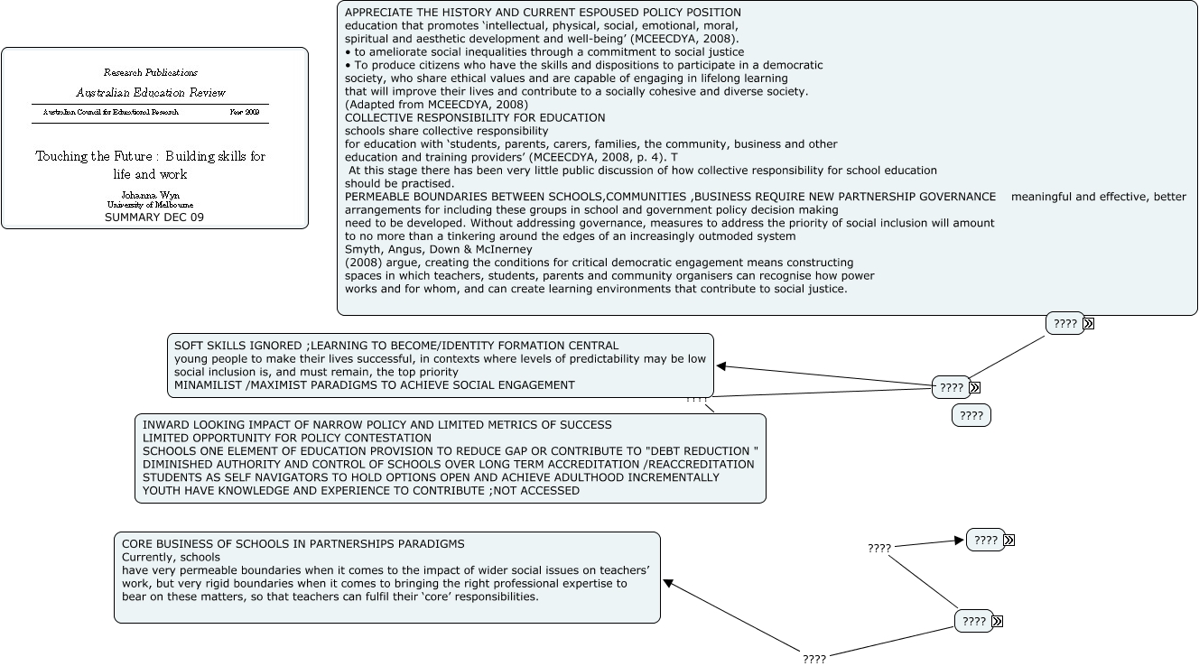 This Concept Map, created with IHMC CmapTools, has information related to: WYN 2009 CHALLENGE TO STRUCTURES, ???? ???? INWARD LOOKING IMPACT OF NARROW POLICY AND LIMITED METRICS OF SUCCESS LIMITED OPPORTUNITY FOR POLICY CONTESTATION SCHOOLS ONE ELEMENT OF EDUCATION PROVISION TO REDUCE GAP OR CONTRIBUTE TO "DEBT REDUCTION " DIMINISHED AUTHORITY AND CONTROL OF SCHOOLS OVER LONG TERM ACCREDITATION /REACCREDITATION STUDENTS AS SELF NAVIGATORS TO HOLD OPTIONS OPEN AND ACHIEVE ADULTHOOD INCREMENTALLY YOUTH HAVE KNOWLEDGE AND EXPERIENCE TO CONTRIBUTE ;NOT ACCESSED, ???? ???? CORE BUSINESS OF SCHOOLS IN PARTNERSHIPS PARADIGMS Currently, schools have very permeable boundaries when it comes to the impact of wider social issues on teachers’ work, but very rigid boundaries when it comes to bringing the right professional expertise to bear on these matters, so that teachers can fulfil their ‘core’ responsibilities., ???? ???? ????, ???? ???? SOFT SKILLS IGNORED ;LEARNING TO BECOME/IDENTITY FORMATION CENTRAL young people to make their lives successful, in contexts where levels of predictability may be low social inclusion is, and must remain, the top priority MINAMILIST /MAXIMIST PARADIGMS TO ACHIEVE SOCIAL ENGAGEMENT