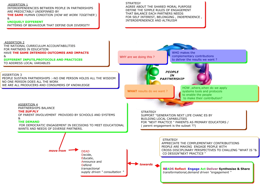 This Concept Map, created with IHMC CmapTools, has information related to: THE POSITION ADOPTED NEXT PRACTICE PARENT EDUCATORS, ASSERTION 4 PARTNERSHIPS BALANCE THE SUPPLY OF PARENT INVOLVEMENT PROVIDED BY SCHOOLS AND SYSTEMS & THE DEMAND FOR DEMOCRATIC ENGAGEMENT IN DECISIONS TO MEET EDUCATIONAL WANTS AND NEEDS OF DIVERSE PARTNERS. move from DEAD Decide, Educate, Announce and Defend transactional supply driven " consultation ", DEAD Decide, Educate, Announce and Defend transactional supply driven " consultation " towards READS Reflect Engage Act Deliver Synthesise & Share transformational,demand driven "engagement "