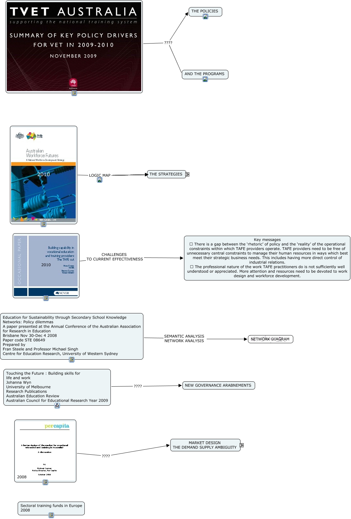 This Concept Map, created with IHMC CmapTools, has information related to: THE VET CONTEXT ANALYSIS, 2010 LOGIC MAP Lift the unacceptably low level of adult language, literacy and numeracy to enable effective educational, labour market and social participation, 2008 ???? MARKET DESIGN THE DEMAND SUPPLY AMBIGUITY, 2010 LOGIC MAP Sustain economic growth and raise productivity by increasing skills and avoiding future skills shortages, ???? ???? AND THE PROGRAMS, 2010 LOGIC MAP Lift the workforce participation rate to 69 per cent by 2025 to provide the required workforce and improve social inclusion, 2010 LOGIC MAP Lead a new partnership approach to workforce development at government, industry and enterprise level, Touching the Future : Building skills for life and work Johanna Wyn University of Melbourne Research Publications Australian Education Review Australian Council for Educational Research Year 2009 ???? NEW GOVERNANCE ARABNEMENTS, 2010 LOGIC MAP Increase productivity, employee engagement and satisfaction by making better use of skills in the workplace, 2010 LOGIC MAP Position the tertiary education sector to ensure it has the capacity to deliver skills for the new economy, Education for Sustainability through Secondary School Knowledge Networks: Policy dilemmas A paper presented at the Annual Conference of the Australian Association for Research in Education Brisbane Nov 30-Dec 4 2008 Paper code STE 08649 Prepared by Fran Steele and Professor Michael Singh Centre for Education Research, University of Western Sydney SEMANTIC ANALYSIS NETWORK ANALYSIS NETWORK DIAGRAM, ???? ???? THE POLICIES, 2010 LOGIC MAP VISION Australia has the workforce capability required for a productive, sustainable and inclusive future. Australian enterprises have the capacity to develop and use the skills of their workforce to maximum advantage for industry and community benefit., 2010 CHALLENGES TO CURRENT EFFECTIVENESS Key messages There is a gap between the ‘rhetoric’ of policy and the ‘reality’ of the operational constraints within which TAFE providers operate. TAFE providers need to be free of unnecessary central constraints to manage their human resources in ways which best meet their strategic business needs. This includes having more direct control of industrial relations. The professional nature of the work TAFE practitioners do is not sufficiently well understood or appreciated. More attention and resources need to be devoted to work design and workforce development.