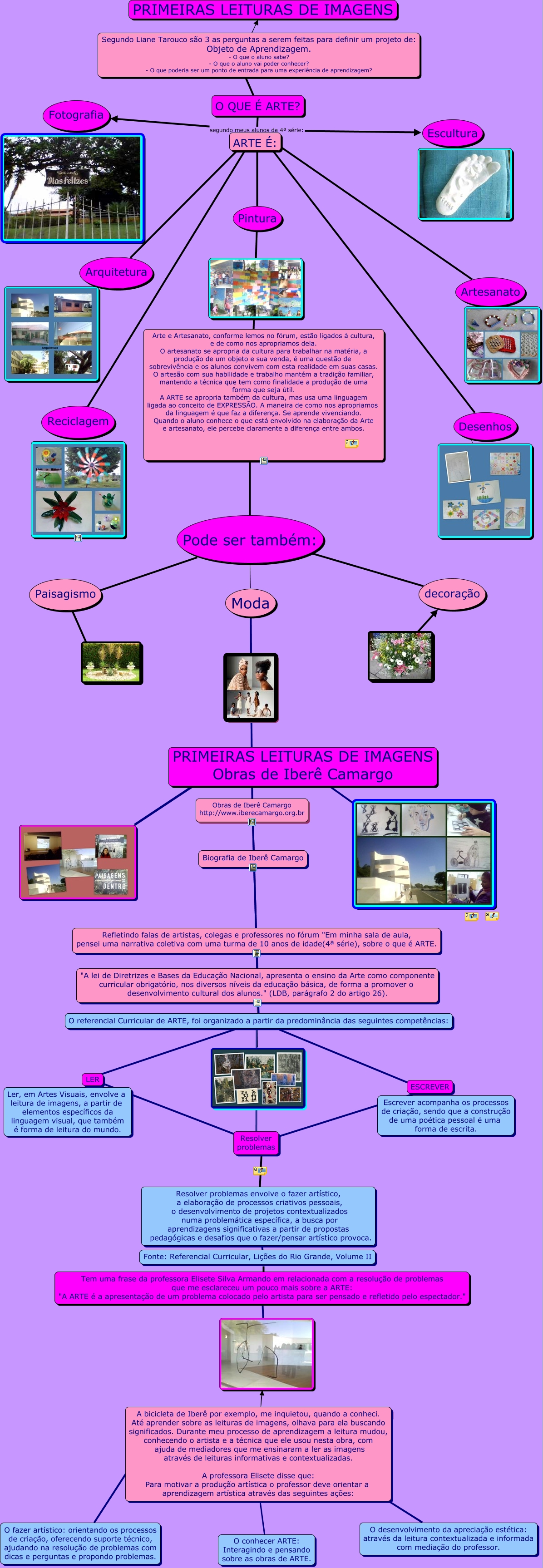 Esse mapa conceitual, produzido no IHMC CmapTools, tem a informação relacionada a: O que é ARTE, O QUE É ARTE? segundo meus alunos da 4ª série: Desenhos, O QUE É ARTE? segundo meus alunos da 4ª série: Arquitetura, Pintura e Pode ser também:, O desenvolvimento da apreciação estética: através da leitura contextualizada e informada com mediação do professor. ????, O fazer artístico: orientando os processos de criação, oferecendo suporte técnico, ajudando na resolução de problemas com dicas e perguntas e propondo problemas. ???? A bicicleta de Iberê por exemplo, me inquietou, quando a conheci. Até aprender sobre as leituras de imagens, olhava para ela buscando significados. Durante meu processo de aprendizagem a leitura mudou, conhecendo o artista e a técnica que ele usou nesta obra, com ajuda de mediadores que me ensinaram a ler as imagens através de leituras informativas e contextualizadas. A professora Elisete disse que: Para motivar a produção artística o professor deve orientar a aprendizagem artística através das seguintes ações:, O QUE É ARTE? segundo meus alunos da 4ª série: Pintura, O QUE É ARTE? segundo meus alunos da 4ª série: Artesanato, Refletindo falas de artistas, colegas e professores no fórum "Em minha sala de aula, pensei uma narrativa coletiva com uma turma de 10 anos de idade(4ª série), sobre o que é ARTE. ???? "A lei de Diretrizes e Bases da Educação Nacional, apresenta o ensino da Arte como componente curricular obrigatório, nos diversos níveis da educação básica, de forma a promover o desenvolvimento cultural dos alunos." (LDB, parágrafo 2 do artigo 26)., Resolver problemas ???? Resolver problemas envolve o fazer artístico, a elaboração de processos criativos pessoais, o desenvolvimento de projetos contextualizados numa problemática específica, a busca por aprendizagens significativas a partir de propostas pedagógicas e desafios que o fazer/pensar artístico provoca., Pode ser também: a decoração, O referencial Curricular de ARTE, foi organizado a partir da predominância das seguintes competências: ???? Resolver problemas, Resolver problemas envolve o fazer artístico, a elaboração de processos criativos pessoais, o desenvolvimento de projetos contextualizados numa problemática específica, a busca por aprendizagens significativas a partir de propostas pedagógicas e desafios que o fazer/pensar artístico provoca. ???? Tem uma frase da professora Elisete Silva Armando em relacionada com a resolução de problemas que me esclareceu um pouco mais sobre a ARTE: "A ARTE é a apresentação de um problema colocado pelo artista para ser pensado e refletido pelo espectador.", Pode ser também: ???? Paisagismo, O referencial Curricular de ARTE, foi organizado a partir da predominância das seguintes competências: ???? ESCREVER, O QUE É ARTE? ???? Segundo Liane Tarouco são 3 as perguntas a serem feitas para definir um projeto de: Objeto de Aprendizagem. - O que o aluno sabe? - O que o aluno vai poder conhecer? - O que poderia ser um ponto de entrada para uma experiência de aprendizagem?, A bicicleta de Iberê por exemplo, me inquietou, quando a conheci. Até aprender sobre as leituras de imagens, olhava para ela buscando significados. Durante meu processo de aprendizagem a leitura mudou, conhecendo o artista e a técnica que ele usou nesta obra, com ajuda de mediadores que me ensinaram a ler as imagens através de leituras informativas e contextualizadas. A professora Elisete disse que: Para motivar a produção artística o professor deve orientar a aprendizagem artística através das seguintes ações: ????, A bicicleta de Iberê por exemplo, me inquietou, quando a conheci. Até aprender sobre as leituras de imagens, olhava para ela buscando significados. Durante meu processo de aprendizagem a leitura mudou, conhecendo o artista e a técnica que ele usou nesta obra, com ajuda de mediadores que me ensinaram a ler as imagens através de leituras informativas e contextualizadas. A professora Elisete disse que: Para motivar a produção artística o professor deve orientar a aprendizagem artística através das seguintes ações: ???? O conhecer ARTE: Interagindo e pensando sobre as obras de ARTE., ???? PRIMEIRAS LEITURAS DE IMAGENS Obras de Iberê Camargo, Pode ser também: ???? Moda, Refletindo falas de artistas, colegas e professores no fórum "Em minha sala de aula, pensei uma narrativa coletiva com uma turma de 10 anos de idade(4ª série), sobre o que é ARTE. ???? "A lei de Diretrizes e Bases da Educação Nacional, apresenta o ensino da Arte como componente curricular obrigatório, nos diversos níveis da educação básica, de forma a promover o desenvolvimento cultural dos alunos." (LDB, parágrafo 2 do artigo 26).