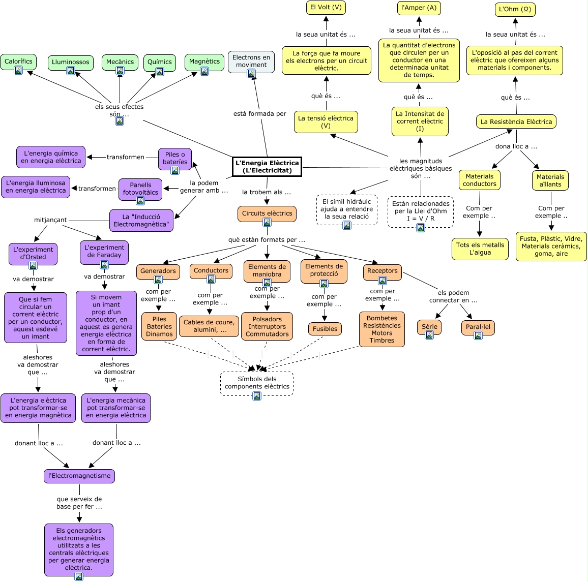 Aquest mapa conceptual conté informació relacionada amb: L'Energia Elèctrica, Circuits elèctrics què estàn formats per ... Elements de protecció, Circuits elèctrics què estàn formats per ... Generadors, Elements de maniobra com per exemple ... Polsadors Interruptors Commutadors, L'Energia Elèctrica (L'Electricitat) està formada per Electrons en moviment, Si movem un imant prop d'un conductor, en aquest es genera energia elèctrica en forma de corrent elèctric. aleshores va demostrar que ... L'energia mecànica pot transformar-se en energia elèctrica, L'Energia Elèctrica (L'Electricitat) les magnituds elèctriques bàsiques són ... La Resistència Elèctrica, L'Energia Elèctrica (L'Electricitat) els seus efectes són ... Lluminossos, L'experiment de Faraday va demostrar Si movem un imant prop d'un conductor, en aquest es genera energia elèctrica en forma de corrent elèctric., L'Energia Elèctrica (L'Electricitat) els seus efectes són ... Magnètics, Materials aïllants Com per exemple .. Fusta, Plàstic, Vidre, Materials ceràmics, goma, aire, L'Energia Elèctrica (L'Electricitat) les magnituds elèctriques bàsiques són ... Estàn relacionades per la Llei d'Ohm I = V / R, Materials conductors Com per exemple .. Tots els metalls L'aigua, Piles Bateries Dinamos Símbols dels components elèctrics, L'Energia Elèctrica (L'Electricitat) les magnituds elèctriques bàsiques són ... La tensió elèctrica (V), La "Inducció Electromagnètica" mitjançant L'experiment d'Orsted, La Resistència Elèctrica què és ... L'oposició al pas del corrent elèctric que ofereixen alguns materials i components., L'Energia Elèctrica (L'Electricitat) els seus efectes són ... Químics, L'experiment d'Orsted va demostrar Que si fem circular un corrent elèctric per un conductor, aquest esdevé un imant, Polsadors Interruptors Commutadors Símbols dels components elèctrics, Receptors els podem connectar en ... Sèrie