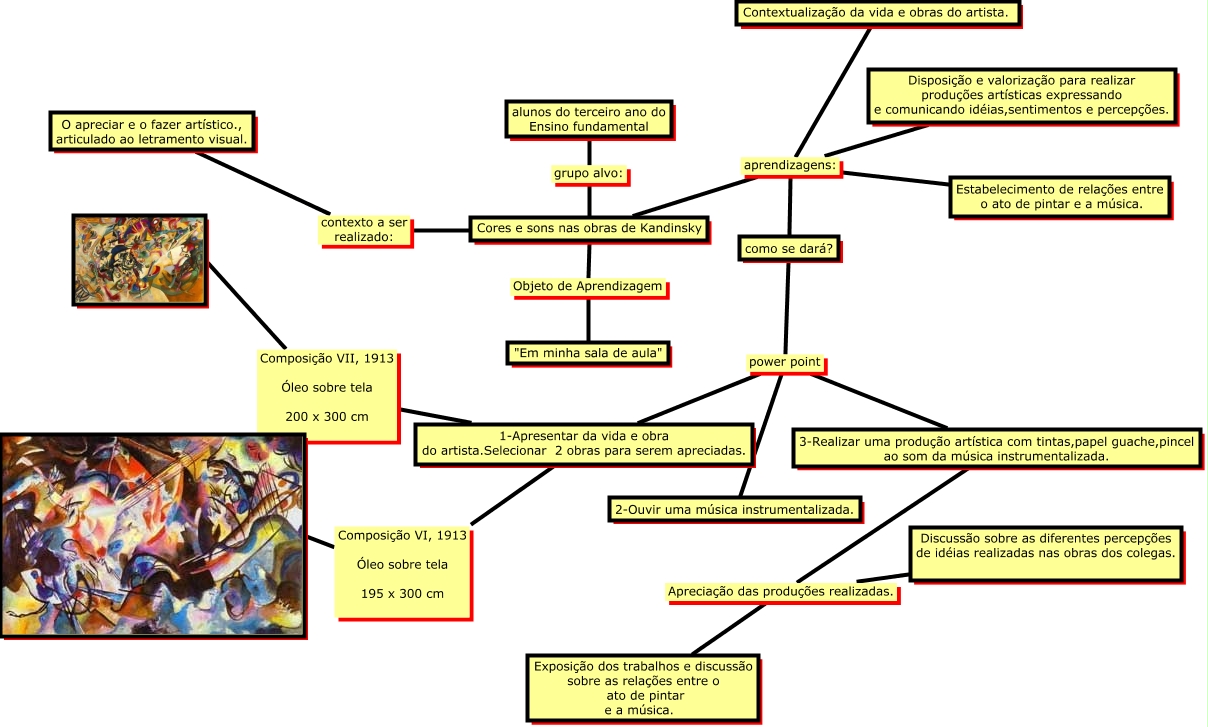 Esse mapa conceitual, produzido no IHMC CmapTools, tem a informação relacionada a: minha sala de aula, 2-Ouvir uma música instrumentalizada. power point como se dará?, 1-Apresentar da vida e obra do artista.Selecionar 2 obras para serem apreciadas. power point como se dará?, Cores e sons nas obras de Kandinsky Objeto de Aprendizagem "Em minha sala de aula", O apreciar e o fazer artístico., articulado ao letramento visual. contexto a ser realizado: Cores e sons nas obras de Kandinsky, Contextualização da vida e obras do artista. aprendizagens: Cores e sons nas obras de Kandinsky, Estabelecimento de relações entre o ato de pintar e a música. aprendizagens: Cores e sons nas obras de Kandinsky, Composição VII, 1913 Óleo sobre tela 200 x 300 cm 1-Apresentar da vida e obra do artista.Selecionar 2 obras para serem apreciadas., como se dará? aprendizagens: Cores e sons nas obras de Kandinsky, alunos do terceiro ano do Ensino fundamental grupo alvo: Cores e sons nas obras de Kandinsky, Discussão sobre as diferentes percepções de idéias realizadas nas obras dos colegas. Apreciação das produções realizadas. 3-Realizar uma produção artística com tintas,papel guache,pincel ao som da música instrumentalizada., Composição VI, 1913 Óleo sobre tela 195 x 300 cm 1-Apresentar da vida e obra do artista.Selecionar 2 obras para serem apreciadas., Exposição dos trabalhos e discussão sobre as relações entre o ato de pintar e a música. Apreciação das produções realizadas. 3-Realizar uma produção artística com tintas,papel guache,pincel ao som da música instrumentalizada., 3-Realizar uma produção artística com tintas,papel guache,pincel ao som da música instrumentalizada. power point como se dará?, Disposição e valorização para realizar produções artísticas expressando e comunicando idéias,sentimentos e percepções. aprendizagens: Cores e sons nas obras de Kandinsky