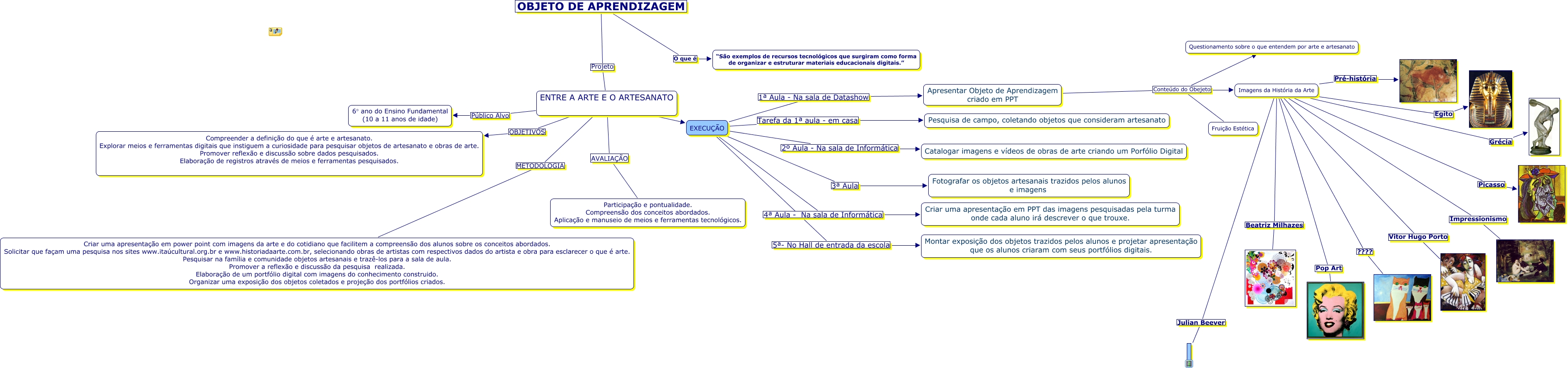 Esse mapa conceitual, produzido no IHMC CmapTools, tem a informação relacionada a: Clara-Objeto de Aprendizagem, Imagens da História da Arte Pré-história, ENTRE A ARTE E O ARTESANATO AVALIAÇÃO Participação e pontualidade. Compreensão dos conceitos abordados. Aplicação e manuseio de meios e ferramentas tecnológicos., Imagens da História da Arte Vitor Hugo Porto, Imagens da História da Arte Picasso, Imagens da História da Arte Grécia, ENTRE A ARTE E O ARTESANATO ???? EXECUÇÃO, EXECUÇÃO 3ª Aula Fotografar os objetos artesanais trazidos pelos alunos e imagens, Imagens da História da Arte Beatriz Milhazes, EXECUÇÃO 2º Aula - Na sala de Informática Catalogar imagens e vídeos de obras de arte criando um Porfólio Digital, Apresentar Objeto de Aprendizagem criado em PPT Conteúdo do Obejeto Imagens da História da Arte, ENTRE A ARTE E O ARTESANATO Público Alvo 6° ano do Ensino Fundamental (10 a 11 anos de idade), Imagens da História da Arte Julian Beever, EXECUÇÃO 5ª- No Hall de entrada da escola Montar exposição dos objetos trazidos pelos alunos e projetar apresentação que os alunos criaram com seus portfólios digitais., Apresentar Objeto de Aprendizagem criado em PPT Conteúdo do Obejeto Fruição Estética, EXECUÇÃO 4ª Aula - Na sala de Informática Criar uma apresentação em PPT das imagens pesquisadas pela turma onde cada aluno irá descrever o que trouxe., EXECUÇÃO Tarefa da 1ª aula - em casa Pesquisa de campo, coletando objetos que consideram artesanato, Imagens da História da Arte Impressionismo, Imagens da História da Arte Pop Art, Apresentar Objeto de Aprendizagem criado em PPT Conteúdo do Obejeto Questionamento sobre o que entendem por arte e artesanato, EXECUÇÃO 1ª Aula - Na sala de Datashow Apresentar Objeto de Aprendizagem criado em PPT