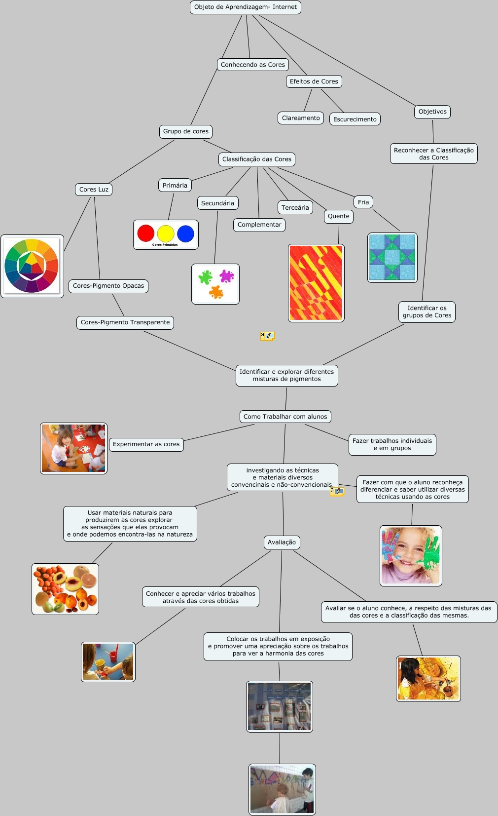Esse mapa conceitual, produzido no IHMC CmapTools, tem a informação relacionada a: Objeto de Aprendizagem, Fria ????, Avaliação ???? Colocar os trabalhos em exposição e promover uma apreciação sobre os trabalhos para ver a harmonia das cores, Quente ????, Grupo de cores ???? Classificação das Cores, Reconhecer a Classificação das Cores ???? ????, Objeto de Aprendizagem- Internet ???? Conhecendo as Cores, investigando as técnicas e materiais diversos convencinais e não-convencionais. ???? Fazer com que o aluno reconheça diferenciar e saber utilizar diversas técnicas usando as cores, Usar materiais naturais para produzirem as cores explorar as sensações que elas provocam e onde podemos encontra-las na natureza ????, Avaliar se o aluno conhece, a respeito das misturas das das cores e a classificação das mesmas. ????, Grupo de cores ???? Cores Luz, Objeto de Aprendizagem- Internet ???? Objetivos, Efeitos de Cores ???? Clareamento, Secundária ????, Grupo de cores ???? Classificação das Cores, Grupo de cores ???? ????, Identificar os grupos de Cores ???? Identificar e explorar diferentes misturas de pigmentos, Classificação das Cores ???? Complementar, Classificação das Cores ???? Quente, Experimentar as cores ????, Conhecer e apreciar vários trabalhos através das cores obtidas ????