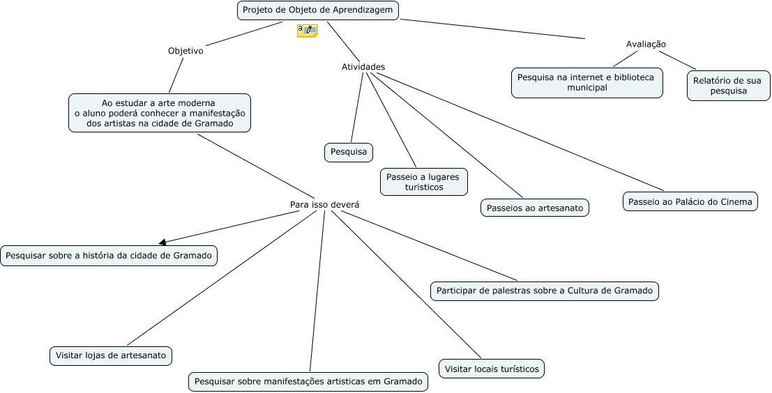 Esse mapa conceitual, produzido no IHMC CmapTools, tem a informação relacionada a: projeto aprendizagem, Ao estudar a arte moderna o aluno poderá conhecer a manifestação dos artistas na cidade de Gramado Para isso deverá Pesquisar sobre a história da cidade de Gramado, Projeto de Objeto de Aprendizagem Atividades Passeios ao artesanato, Projeto de Objeto de Aprendizagem Avaliação Pesquisa na internet e biblioteca municipal, Ao estudar a arte moderna o aluno poderá conhecer a manifestação dos artistas na cidade de Gramado Para isso deverá Participar de palestras sobre a Cultura de Gramado, Ao estudar a arte moderna o aluno poderá conhecer a manifestação dos artistas na cidade de Gramado Para isso deverá Visitar locais turísticos, Projeto de Objeto de Aprendizagem Objetivo Ao estudar a arte moderna o aluno poderá conhecer a manifestação dos artistas na cidade de Gramado, Ao estudar a arte moderna o aluno poderá conhecer a manifestação dos artistas na cidade de Gramado Para isso deverá Visitar lojas de artesanato, Projeto de Objeto de Aprendizagem Atividades Passeio a lugares turisticos, Ao estudar a arte moderna o aluno poderá conhecer a manifestação dos artistas na cidade de Gramado Para isso deverá Pesquisar sobre manifestações artisticas em Gramado, Projeto de Objeto de Aprendizagem Atividades Passeio ao Palácio do Cinema, Projeto de Objeto de Aprendizagem Avaliação Relatório de sua pesquisa, Projeto de Objeto de Aprendizagem Atividades Pesquisa