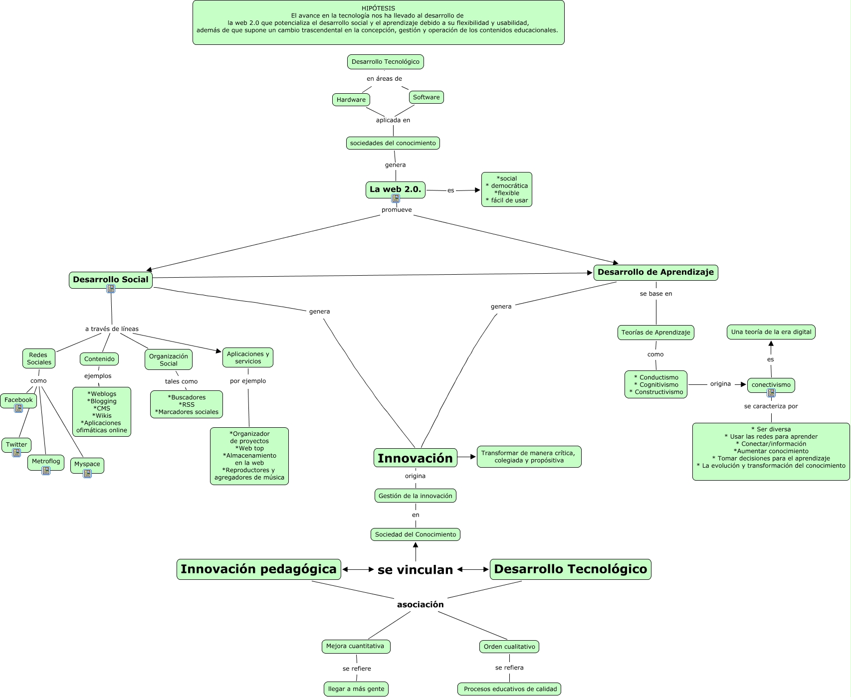 Este Cmap, tiene información relacionada con: mapita, Innovación pedagógica asociación Mejora cuantitativa, Hardware aplicada en sociedades del conocimiento, Desarrollo Tecnológico en áreas de Software, La web 2.0. es *social * democrática *flexible * fácil de usar, Innovación pedagógica se vinculan Sociedad del Conocimiento, Desarrollo Social genera Innovación, Mejora cuantitativa se refiere llegar a más gente, Desarrollo de Aprendizaje genera Innovación, Aplicaciones y servicios por ejemplo *Organizador de proyectos *Web top *Almacenamiento en la web *Reproductores y agregadores de música, Desarrollo Social a través de líneas Contenido, Redes Sociales como Metroflog, Software aplicada en sociedades del conocimiento, Redes Sociales como Facebook, Redes Sociales como Myspace, Innovación pedagógica asociación Orden cualitativo, * Conductismo * Cognitivismo * Constructivismo origina conectivismo, Contenido ejemplos *Weblogs *Blogging *CMS *Wikis *Aplicaciones ofimáticas online, Desarrollo Social a través de líneas Organización Social, La web 2.0. promueve Desarrollo Social, conectivismo es Una teoría de la era digital